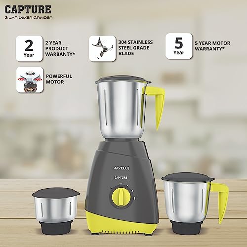Havells Capture 500W 3 Jar Mixer Grinder, High Speed 21000 RPM Motor, 304 SS Blades, 5 Years Motor Warranty with Overload Protector, 1.5 Ltr Bigger Size Blending Jar I (Grey & Green)