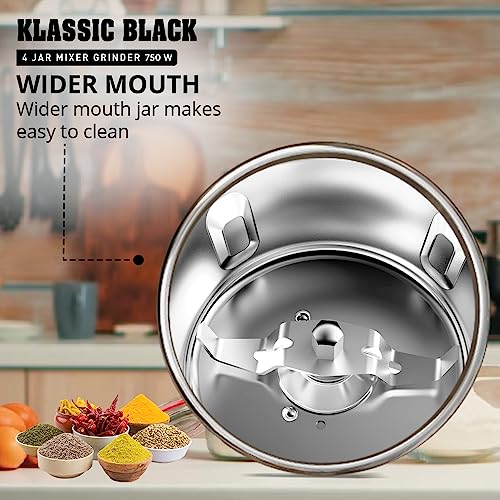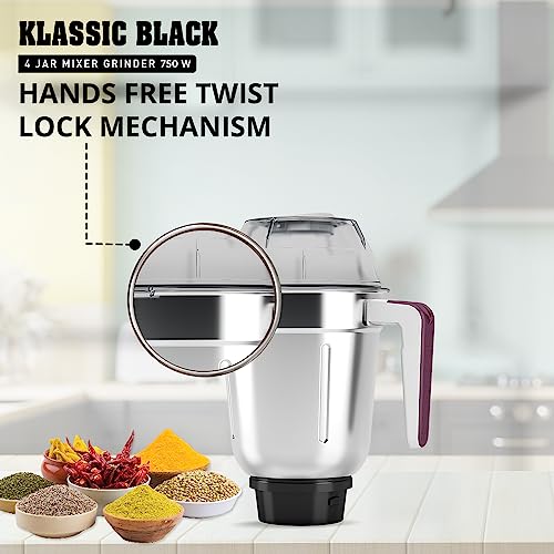 Havells Klassic 750 Watt 4 Jar Mixer Grinder, 21000 RPM Heavy Duty Universal Motor, 304 SS Blades, Large Size Break Resistant JarLids With Twist & Lock Mechanism- Black