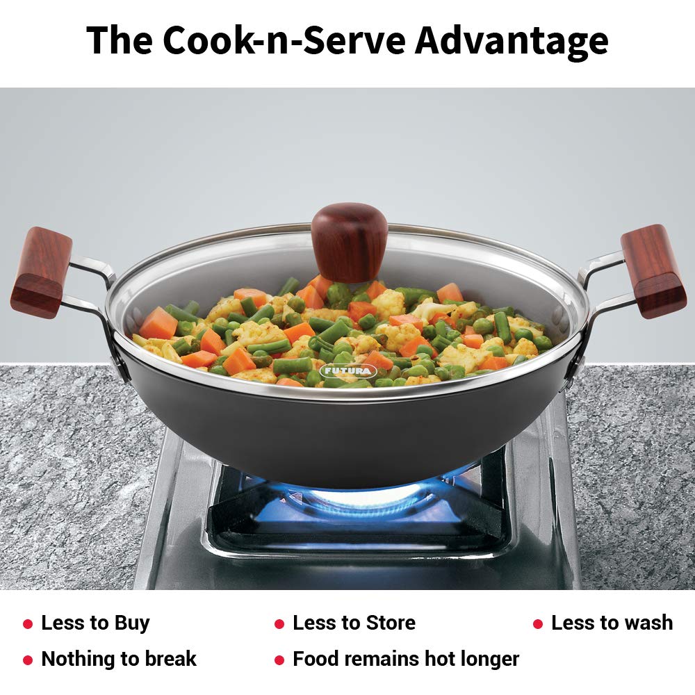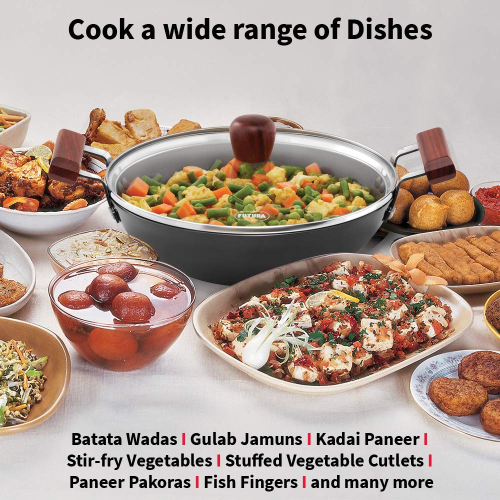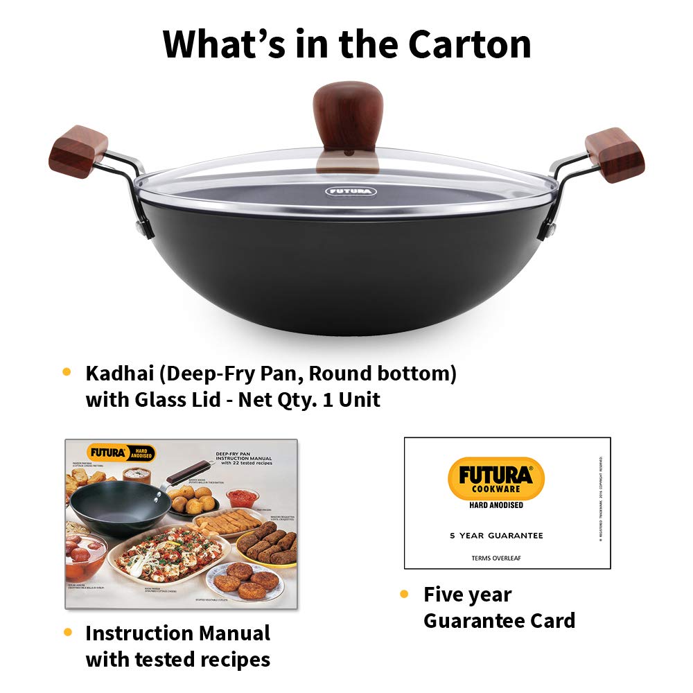 Hawkins Futura 2.5 Litre Fish Fry Kadhai, Hard Anodised Deep Fry Pan with Glass Lid, Round Bottom Kadai, Black (AFFK25G)