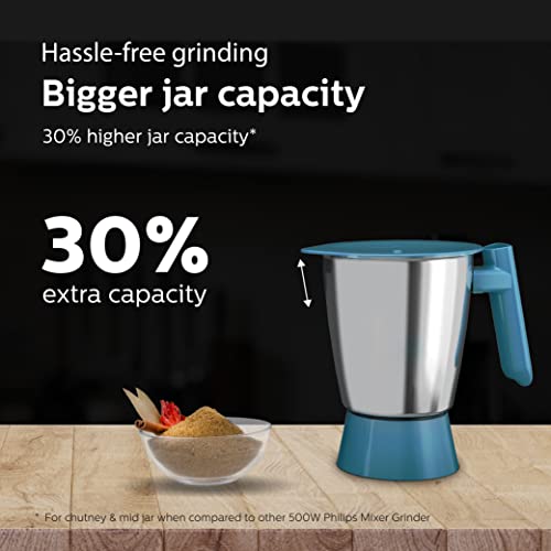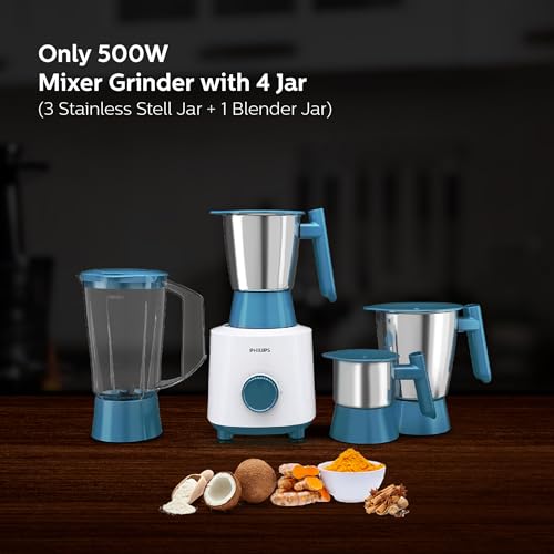 Philips HL7536/01-500 W Mixer Grinder with 4 Jar (3 Stainless Steel Jar +1 Blender Jars), Bigger jar sizes, with 5 Year Warranty on Motor (Indian Plug)