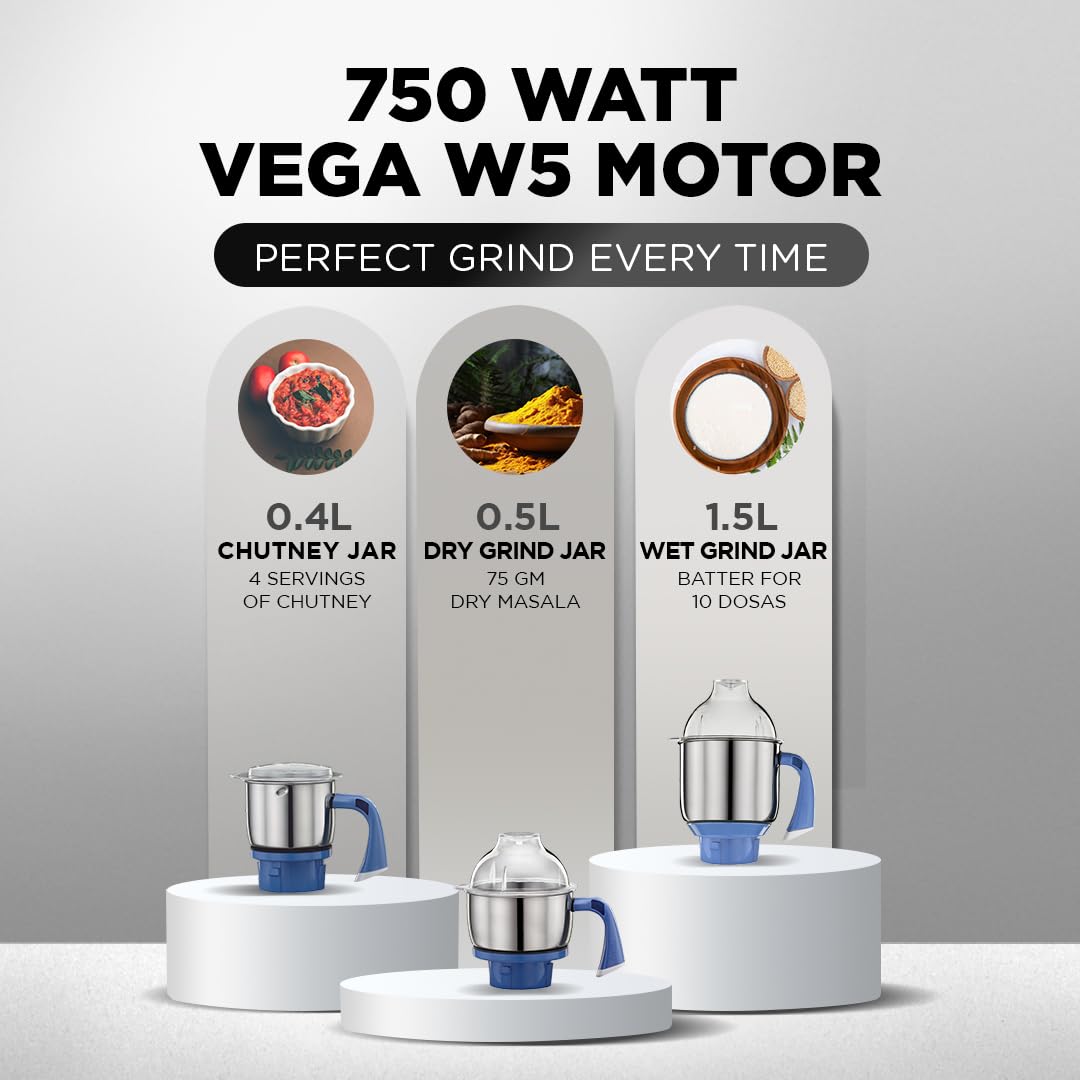 Preethi Blue Leaf Diamond MG-214 750 Watt Mixer Grinder with 3 Jars (Wet Grinding (1.5 litres) + Dry Grinding Jar (0.5 litre) + Chutney Jar (0.4 litre)Stainless steel), Blue/White