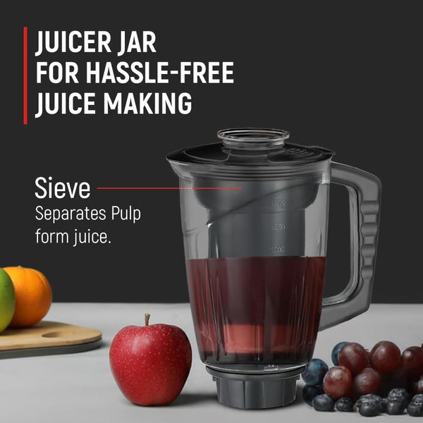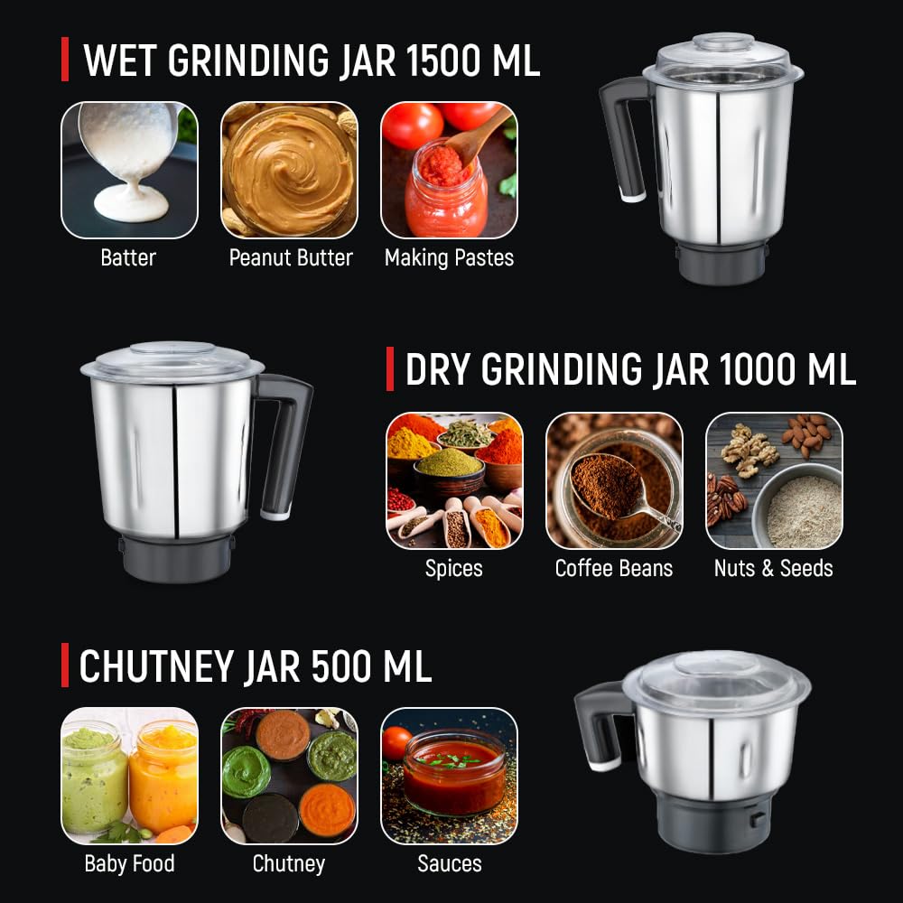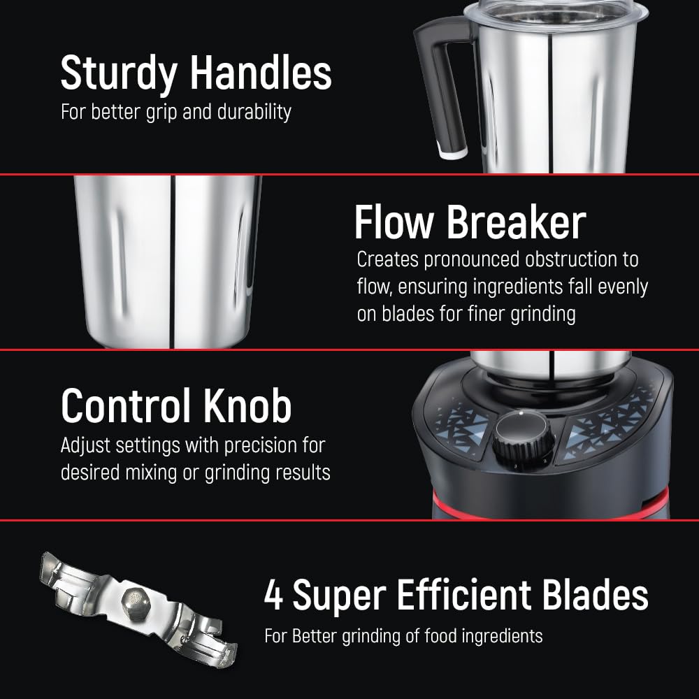 Prestige Hercules 1000W Mixer Grinder with 3 Stainless Steel jars & 1 Juicer jar|Flow-Breaker Design|Sturdy Handles|4 Super Efficient Blades|Black & Red