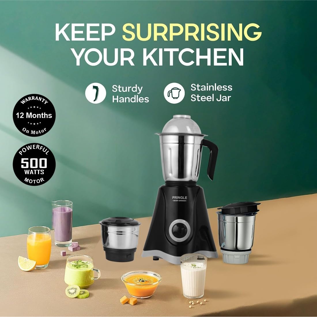 Pringle 2 Jar Mixer Grinder| 500W Powerful Motor | [ISI] Certified | 304 Grade SS Blade| 2 SS Jars Liquidizing Jar (1 Litres) Chutney Jar (0.4 Litres)3 Speed Options with Whip (1 Year Warranty)