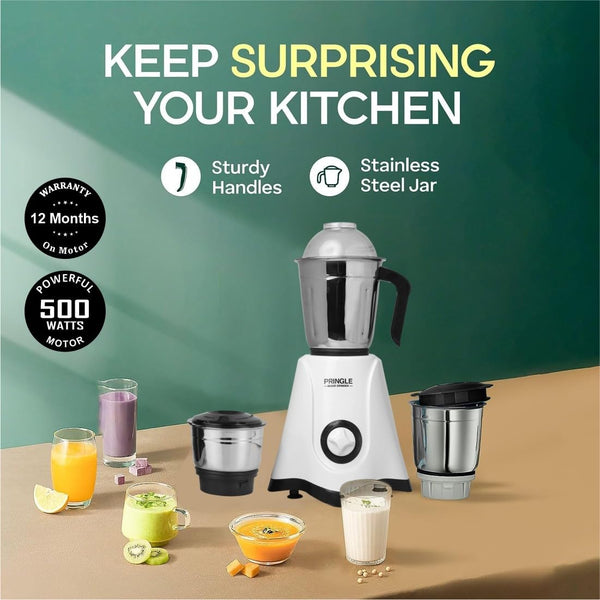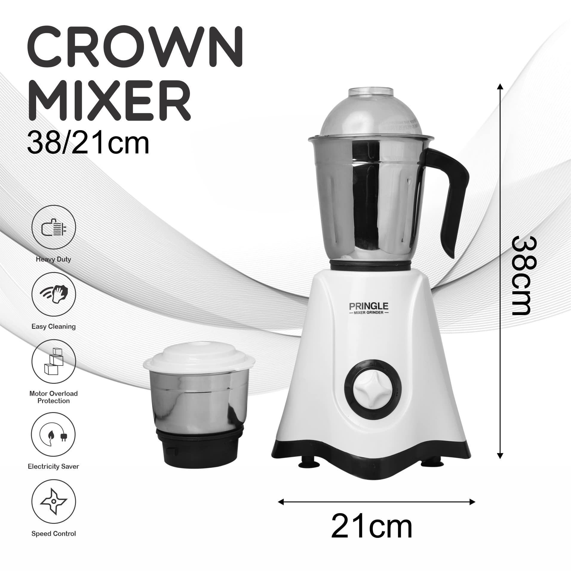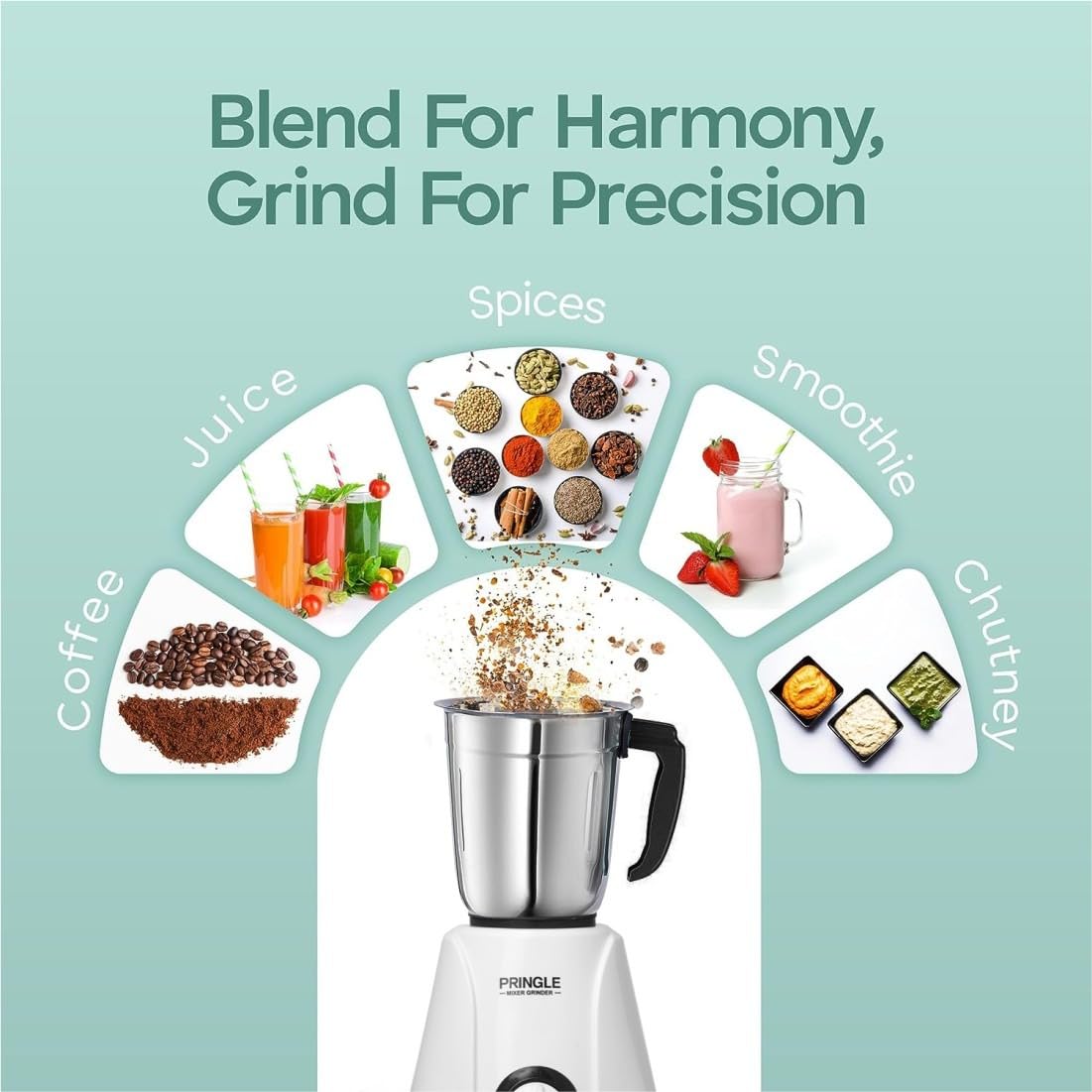 Pringle 2 Jar Mixer Grinder| 500W Powerful Motor | [ISI] Certified | 304 Grade SS Blade| 2 SS Jars Liquidizing Jar (1 Litres) Chutney Jar (0.4 Litres)3 Speed Options with Whip (1 Year Warranty)