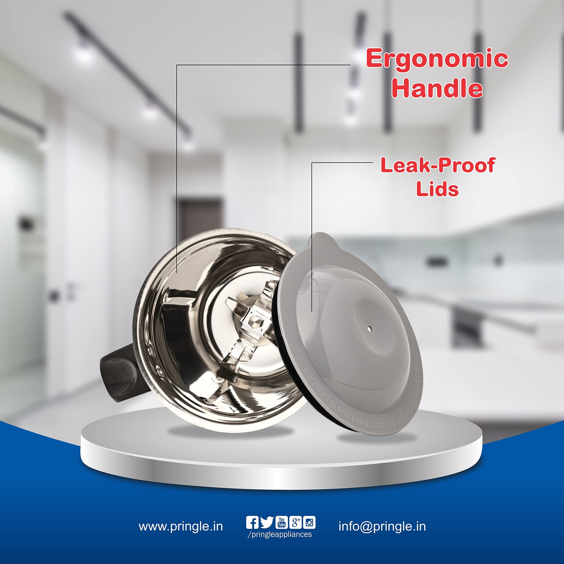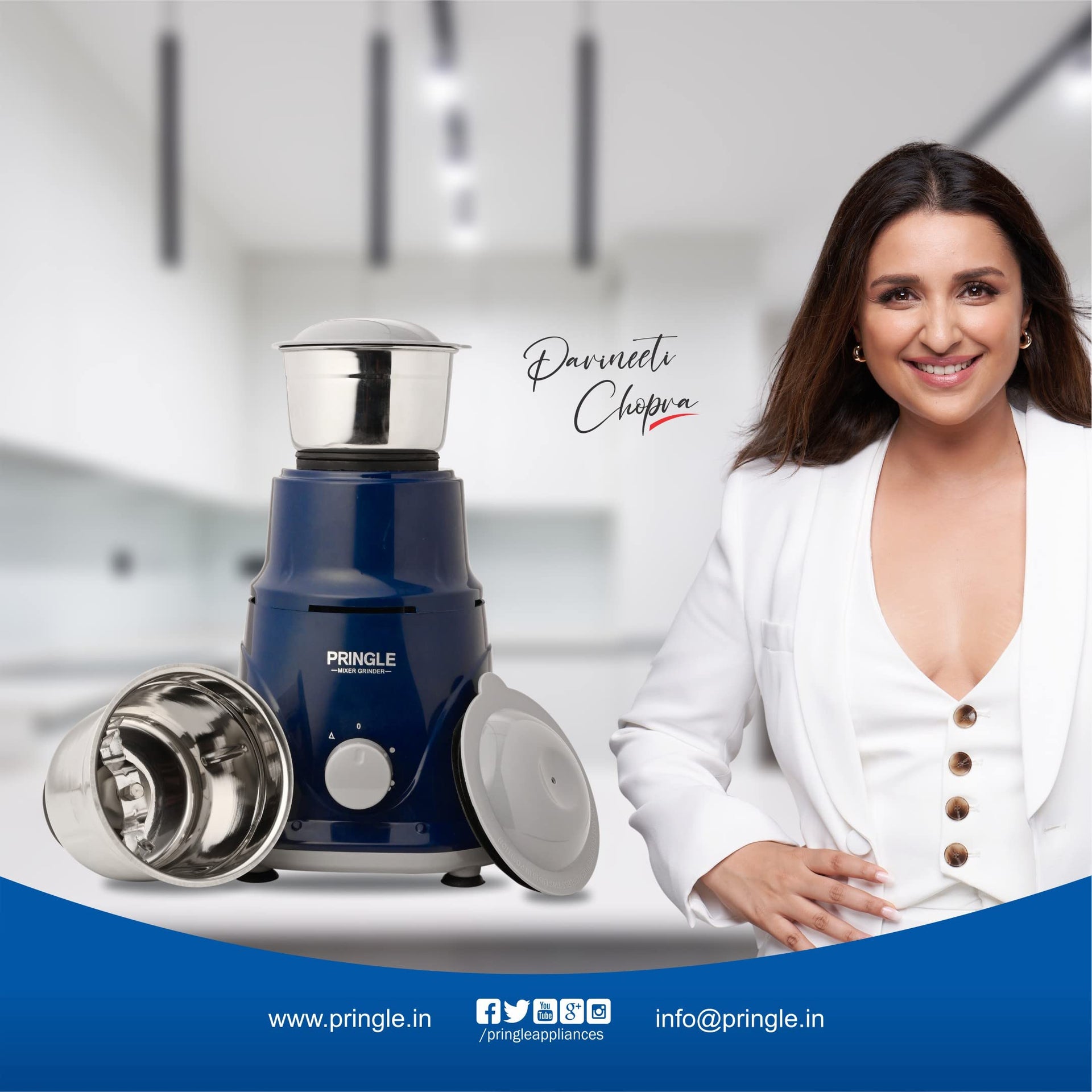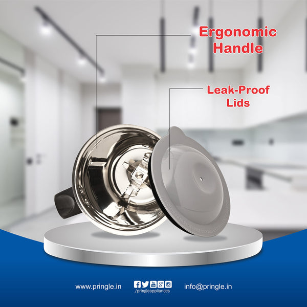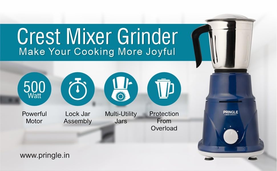 Pringle Crest 2 Jar Mixer Grinder 500W Powerful Motor[ISI] Certified-304 Grade Stainless Steel Blade| 2 Stainless Steel Jars(1 Litres) Chutney Jar (0.25 Litres)3 Speed -Blue