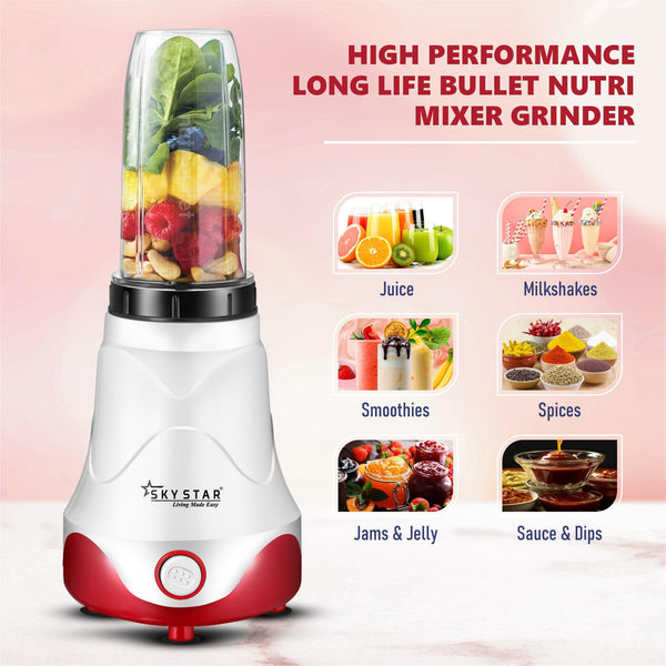 skystar Nutri-Blender Pro 100% Copper Motor With 2 Unbreakable Jars & 1 Blade Juicer Mixer Grinder (2 Jars, White, Red) & 18 Months Motor Warranty, 750 Watts