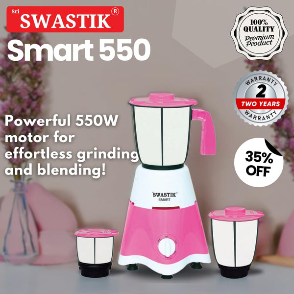 Sri Swastik Smart 550 Mixer Grinder - 550W Heavy-Duty Motor, 3 Stainless Steel Jars, Pink