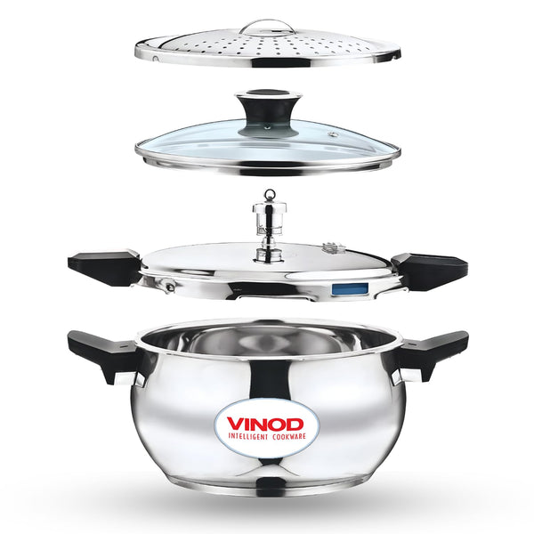 Vinod Magic Stainless Steel Smart 3 in 1 Pressure Cooker 3.5 Litre | 5mm Thick Base | All in One Cooker with Strainer & Glass Lid | Induction and Gas Base | ISI certified | 2 Years Warranty