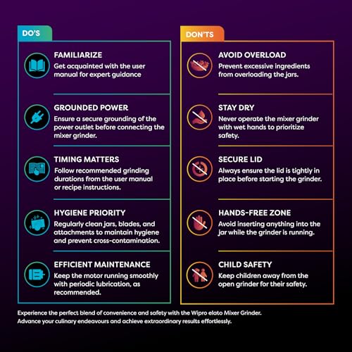 Wipro Elato FMG208 800 Watt Mixer Grinder with 3 Jars,Heavy Duty 100% Copper Ball Bearing Motor with 5 Year Warranty,Superfast Grinding,Clip Lids - Hands Free use, 3 Jars Mixer Grinder 800 Watt,Black