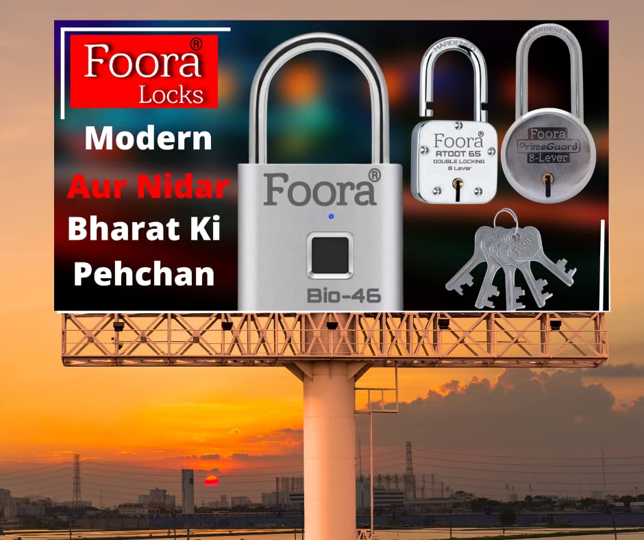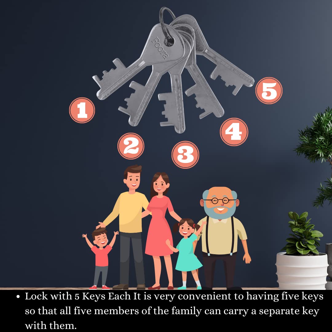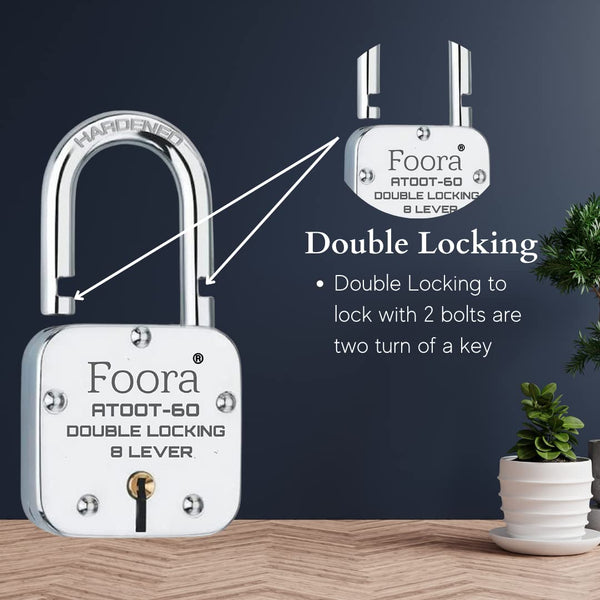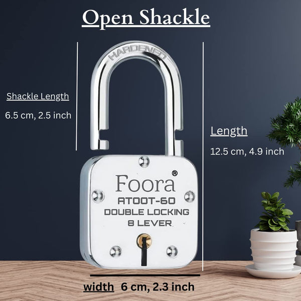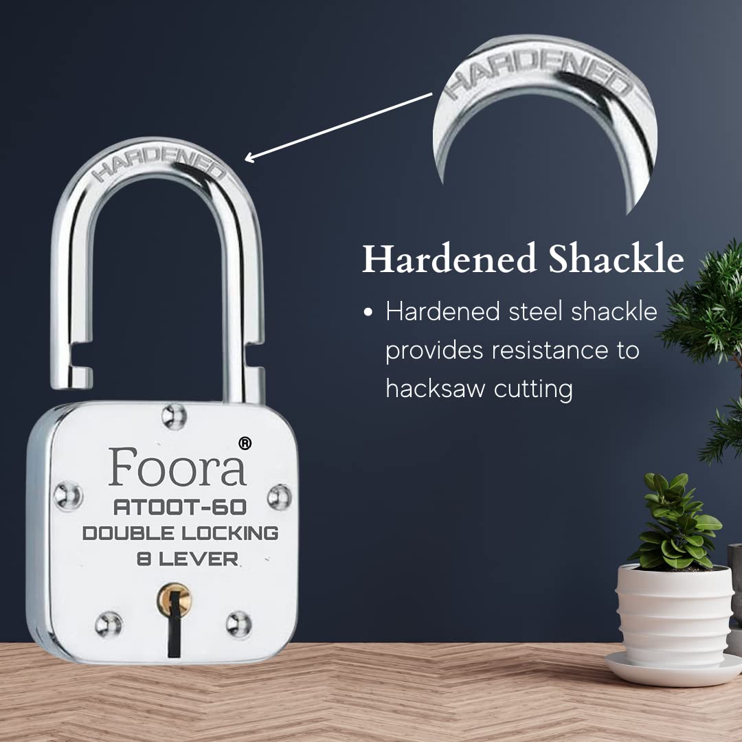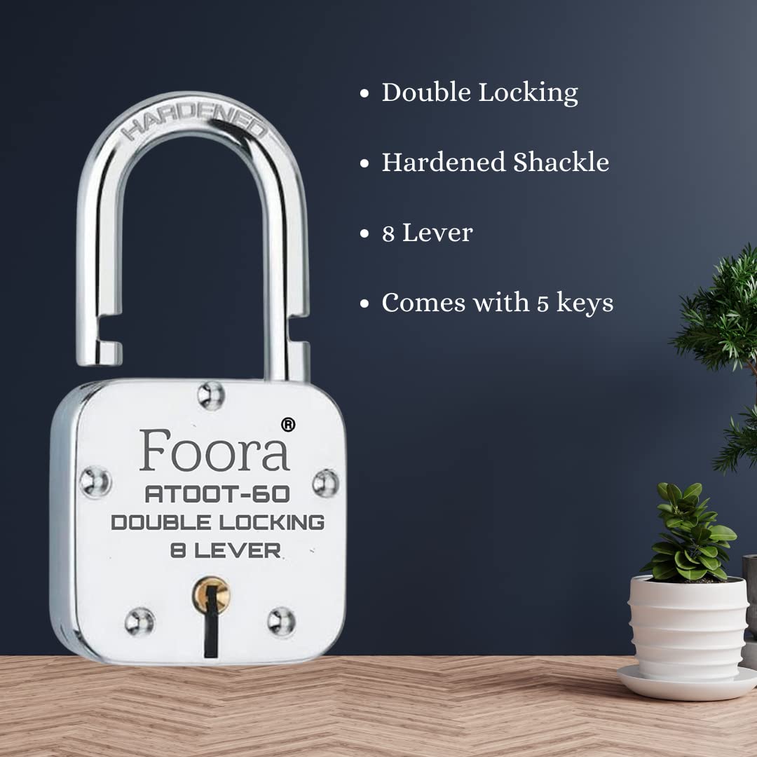 Foora Lock and Keys Door Lock for Home atoot 60mm Hardened Shackle Padlock with 5 Keys and Key Chain Double Locking 8 Lever gate, Shop Shutter (Silver Polished Finish)