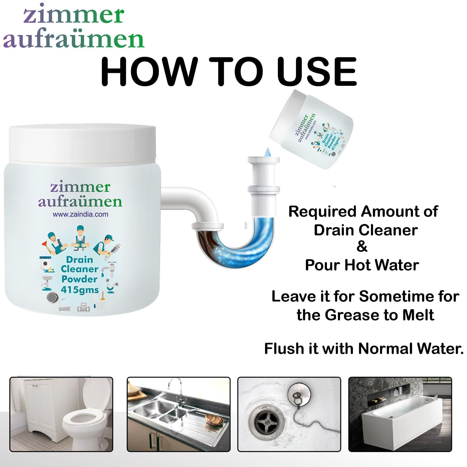 Zimmer Aufraumen 450gms Heavy Duty Drain Cleaner & Blockage Opener Powder. Opens Clogs. Dissolves Hair, Accumulated Soap Scum & Dirt. Biodegradable. Economical.