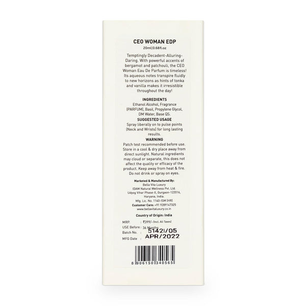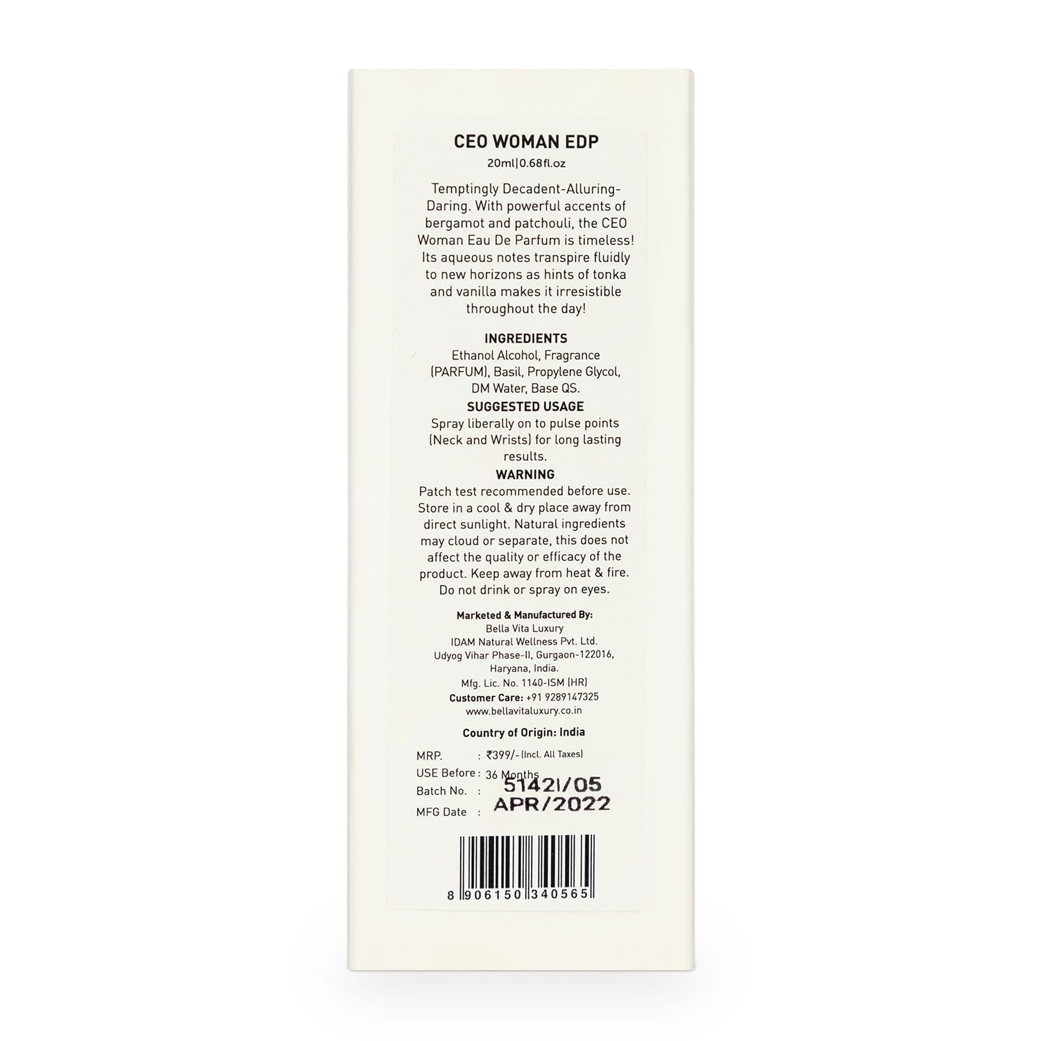 Bella Vita Luxury CEO Woman Eau De Parfum Perfume with Bergamot, Tonka & Vanilla |Premium,Long Lasting Woody & Fruity Fragrance Scent for Women, 20 ML