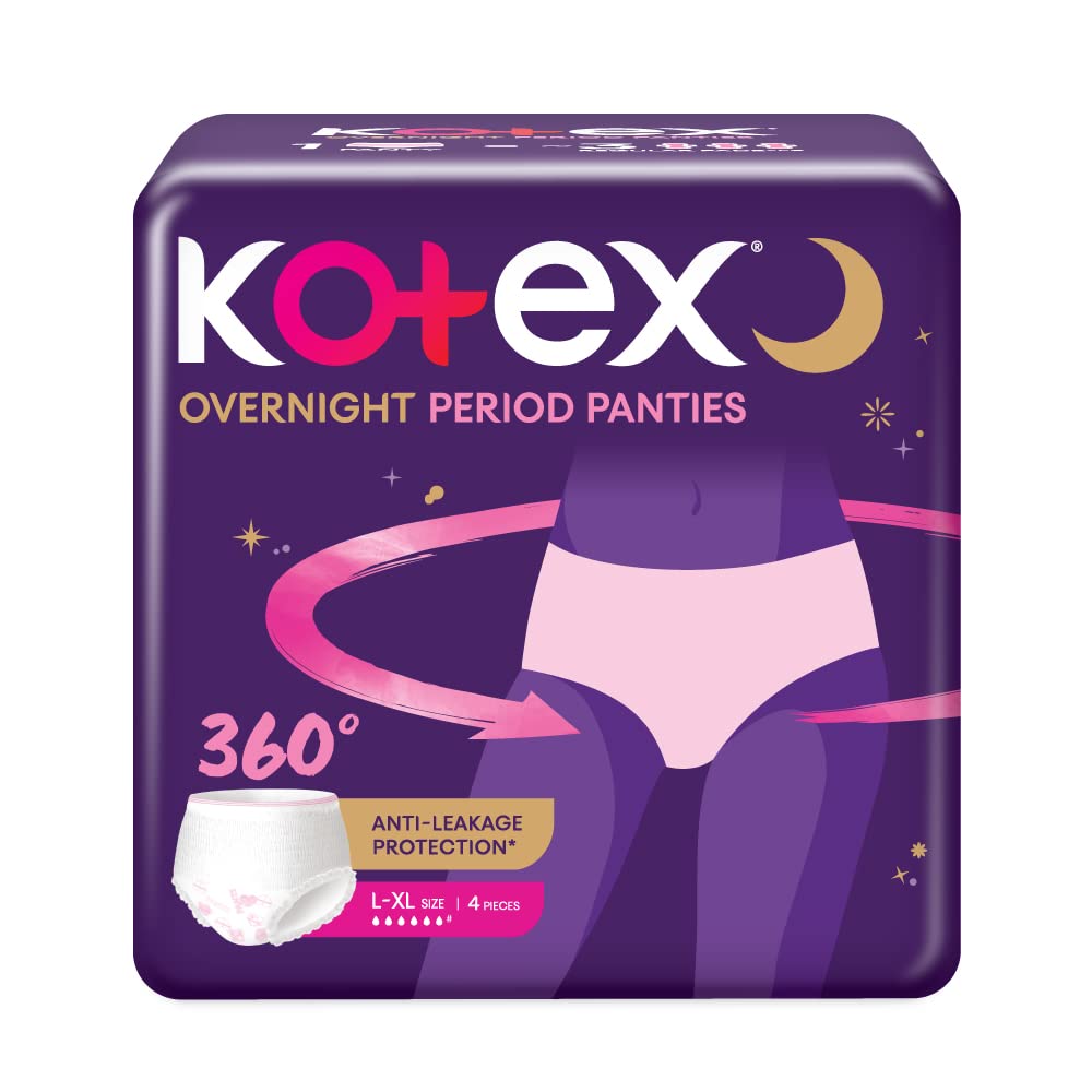 Kotex Overnight Period Panties (Large/Extra-Large size, pack of 4 panties) for heavy flow period protection | with 360 degree anti-leakage design & airy-soft fabric | 1 panty = ~3 regular pads
