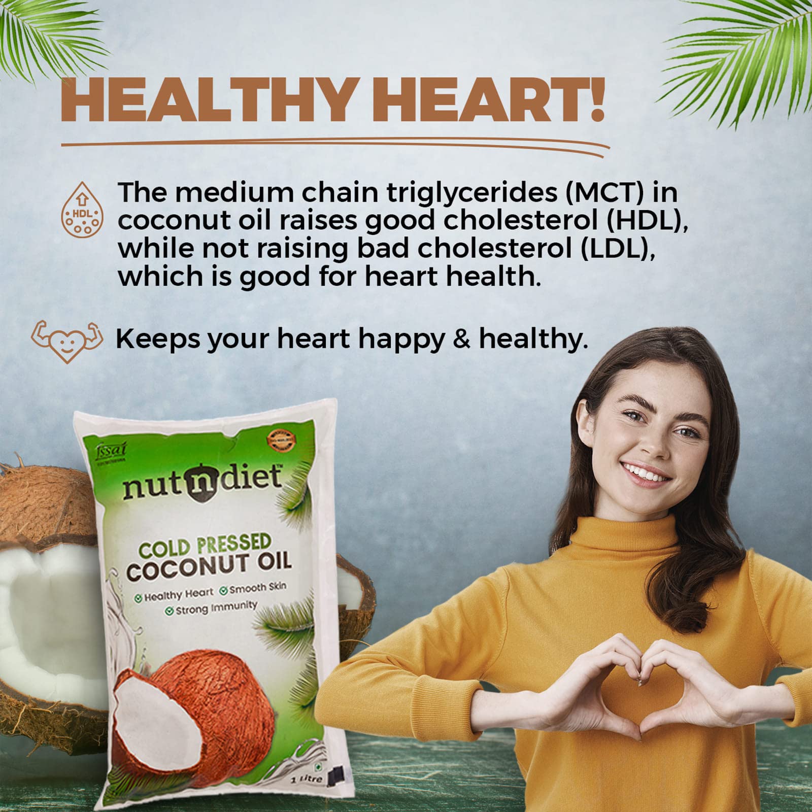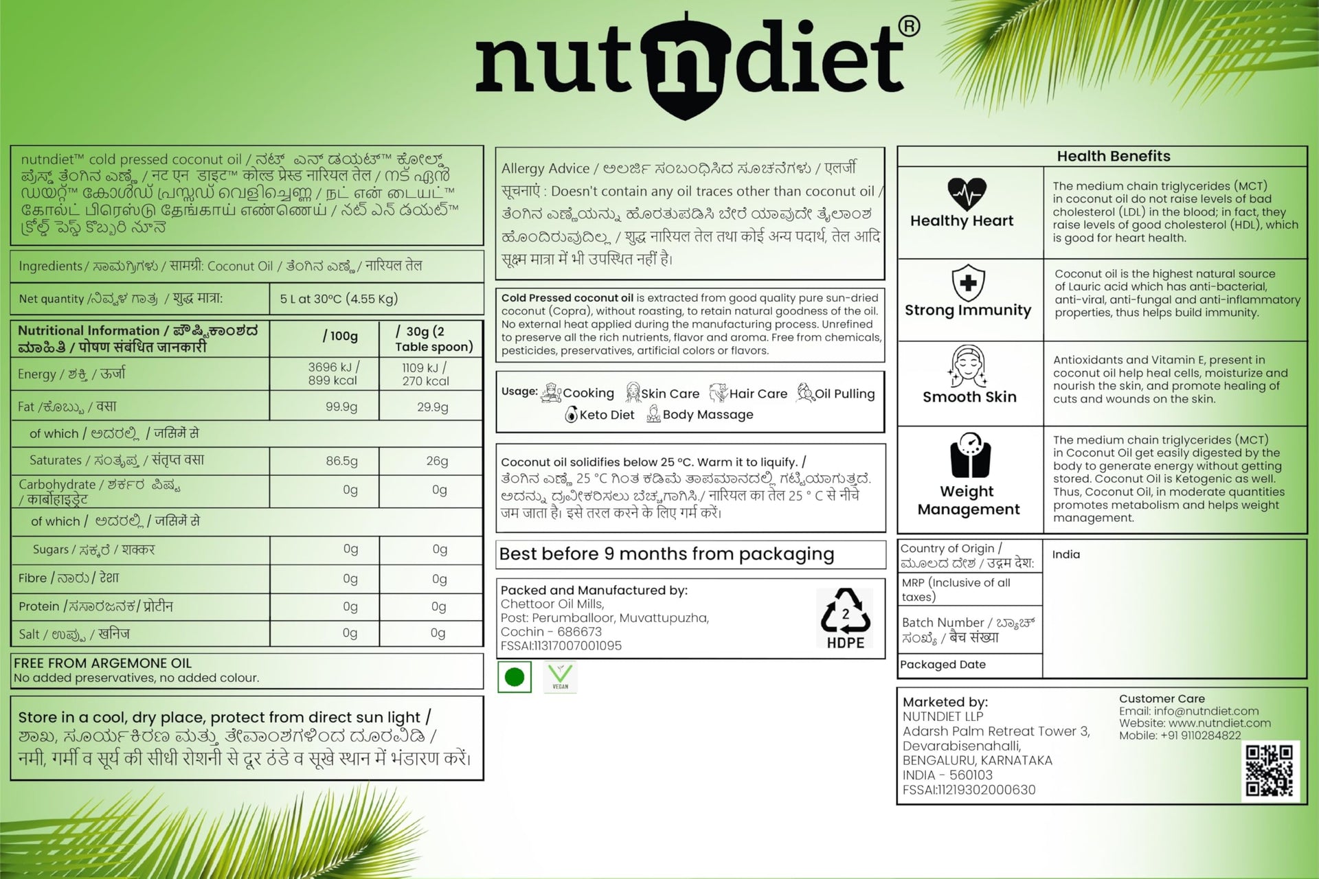 nutndiet Cold Pressed Coconut Oil 5 Litre Can | Pure, Natural & Chemical-Free | Multipurpose Oil for Cooking, Skin Care, Hair Care & Massage | Rich in Nutrients & Antioxidants