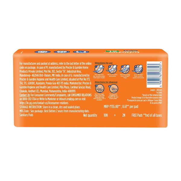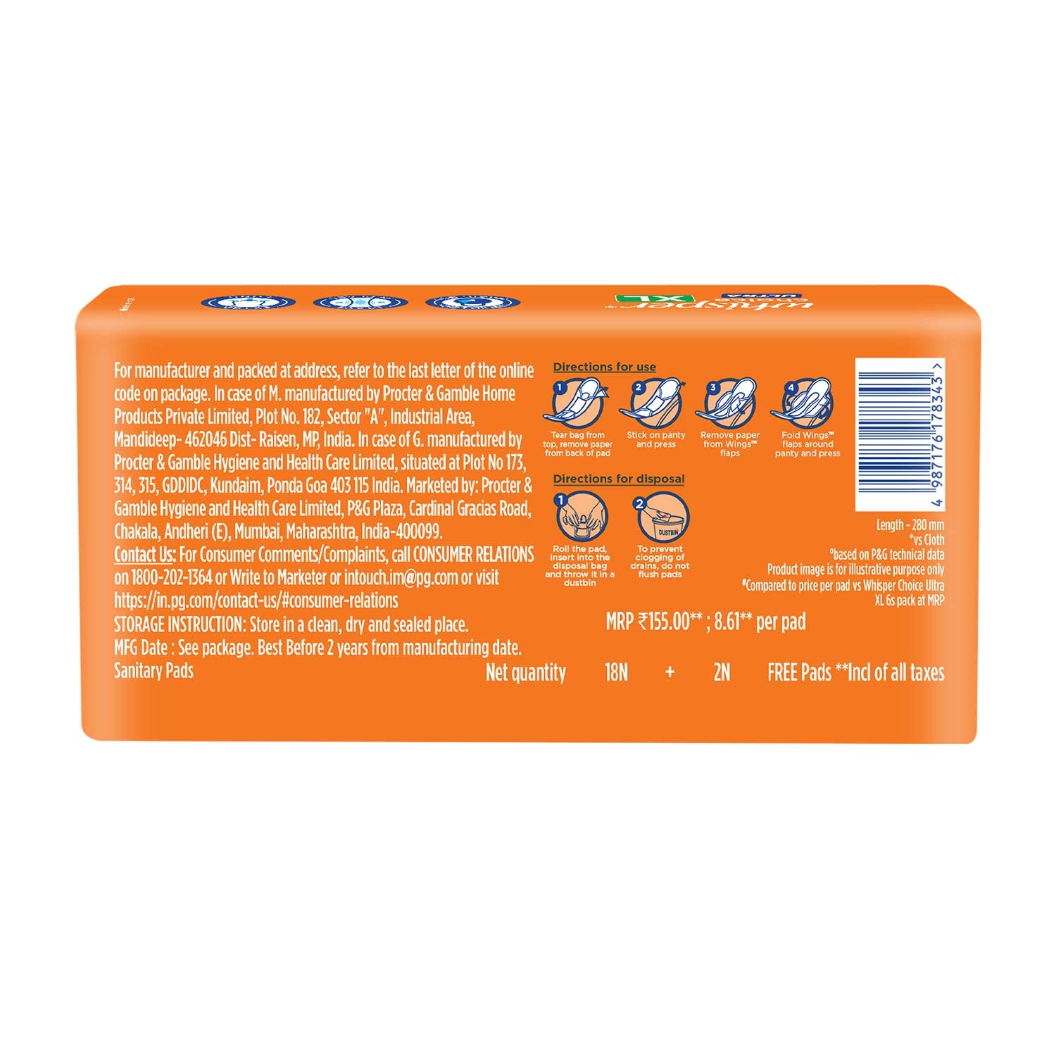 Whisper Choice Ultra XL Sanitary Pads|20 thin Pads|XL|upto 100% Stain protection|side safe Wings|With Liquid lock magic gel|5 cm longer & 20% wider|DRI-weave topsheet|28.4 cm Long|With disposable wrap| 2 Pads Free