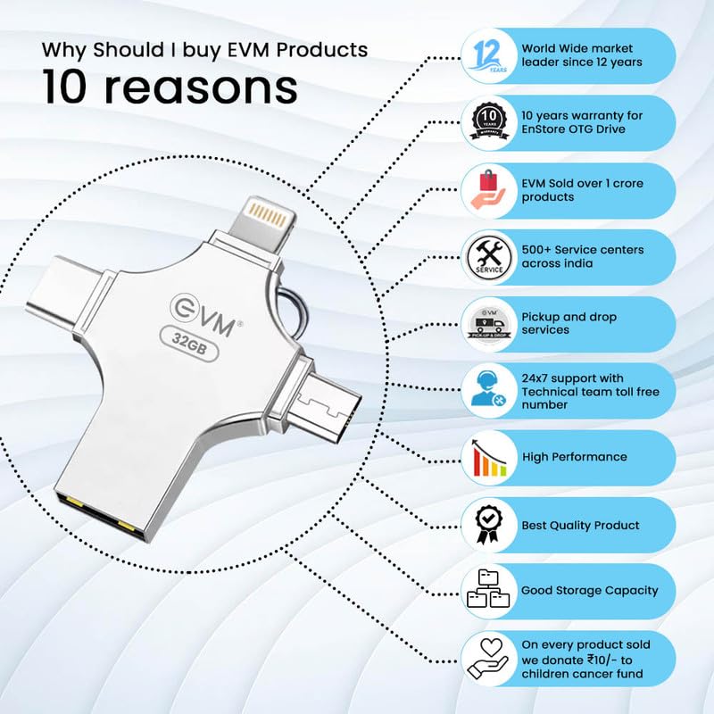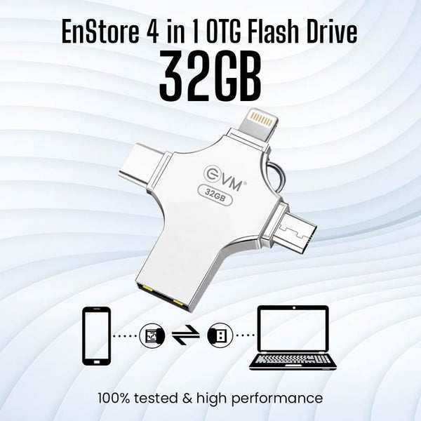EVM EnStore 4in-1 OTG 32GB Flashdrive - High-Speed USB 3.0 - Read Speed - 100Mb/s & Write Speed - 25Mb/s -Transfer Files Between USB-A, Compatible with All Smartphones - (EVM4D/32G)