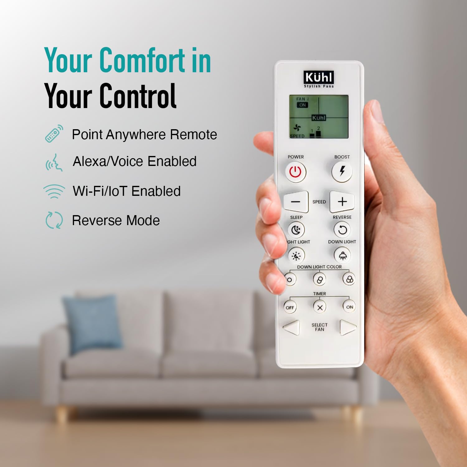 KUHL Platin D5 1200mm Stylish Power Saving BLDC Ceiling Fan with Remote | Down Light | 29W | 5 Star | Low Noise | IoT – Operate via Mobile & Alexa | Reverse Mode | Free Installation | White