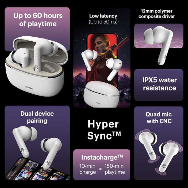 Noise Newly Launched Aura Buds in-Ear Truly Wireless Earbuds with 60H of Playtime, Quad Mic with ENC, Dual Device Pairing, Instacharge(10 min=150 min),12mm Polymer Composite Driver,BT v5.3(Aura White)