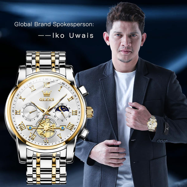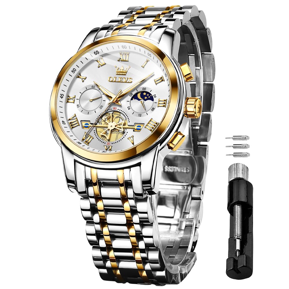 OLEVS Watches for Men Chronograph Business White Wrist Watches Analog Quartz Moon Phase Stainless Steel Waterproof Luminous Dress Watches