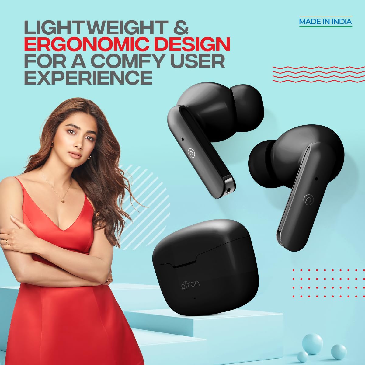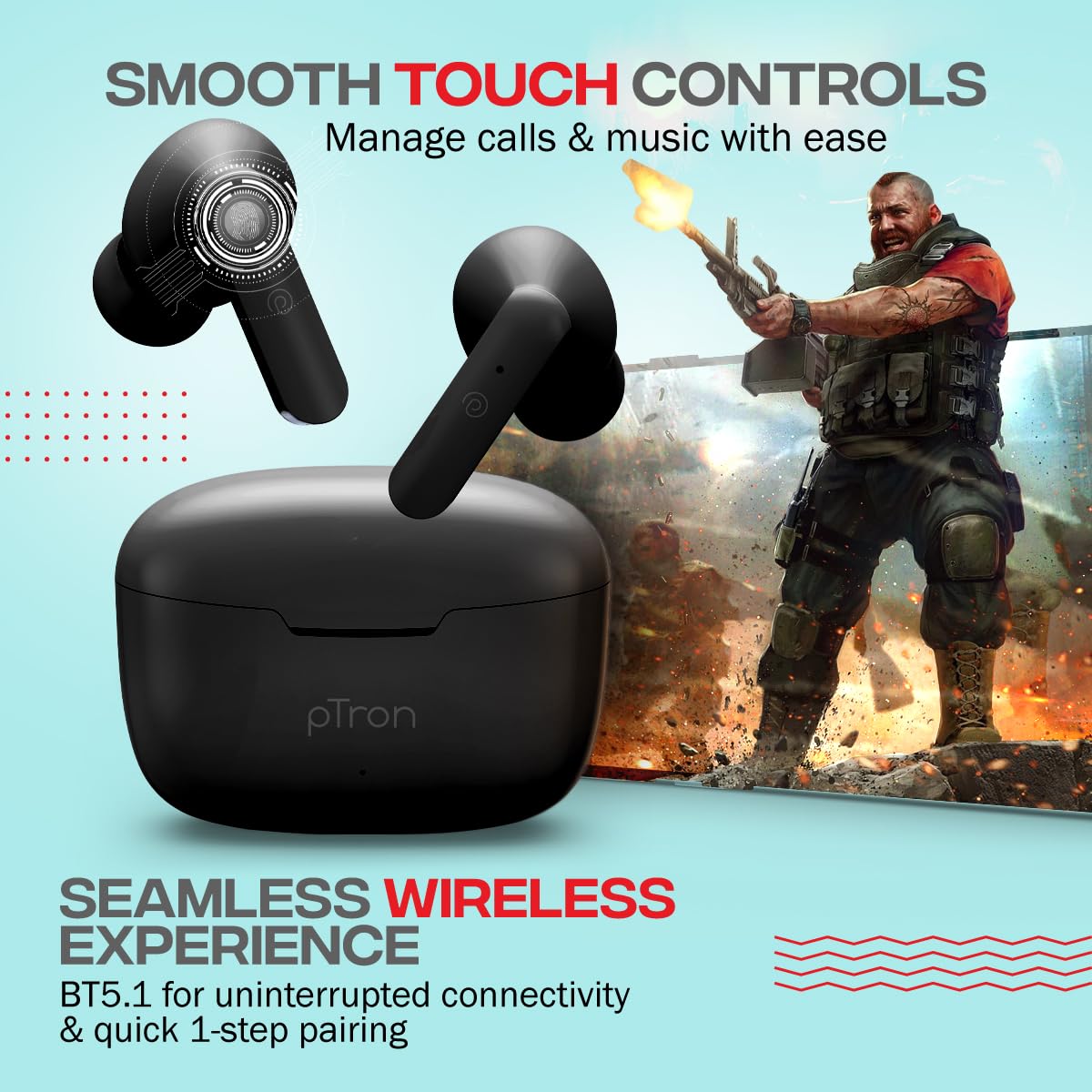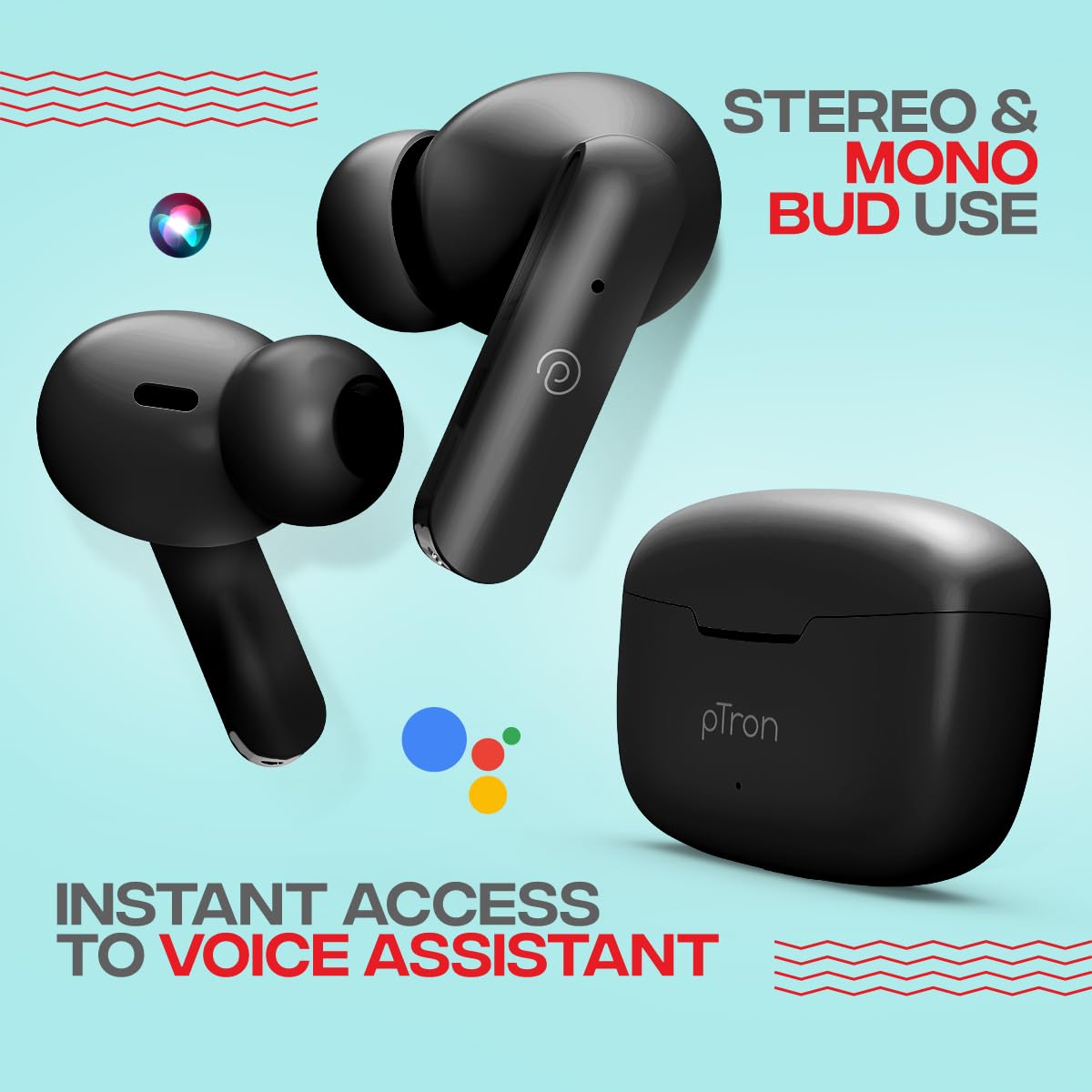 pTron Bassbuds Duo in-Ear Wireless Earbuds, Immersive Sound, 32Hrs Playtime, Clear Calls TWS Earbuds, Bluetooth V5.1 Headphone, Type-C Fast Charging, Voice Assist & IPX4 Water Resistant (Black Matt)