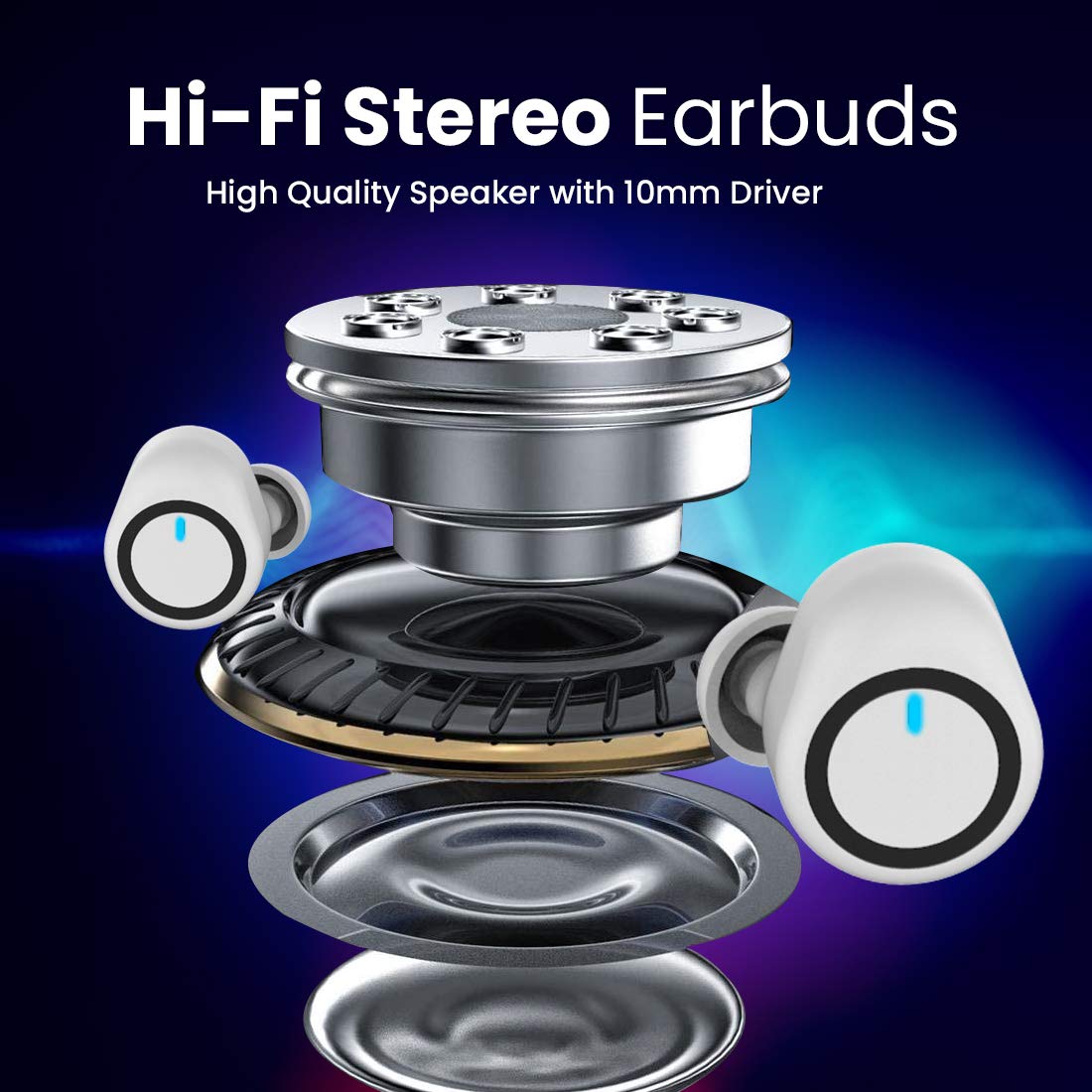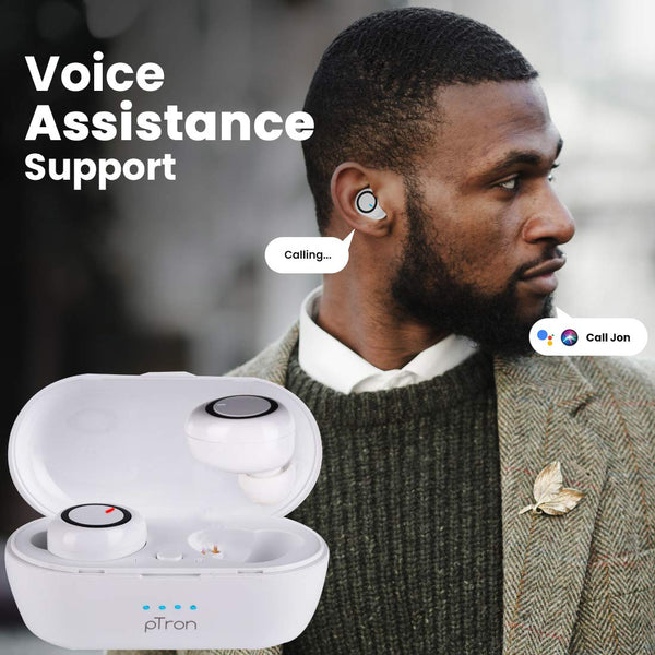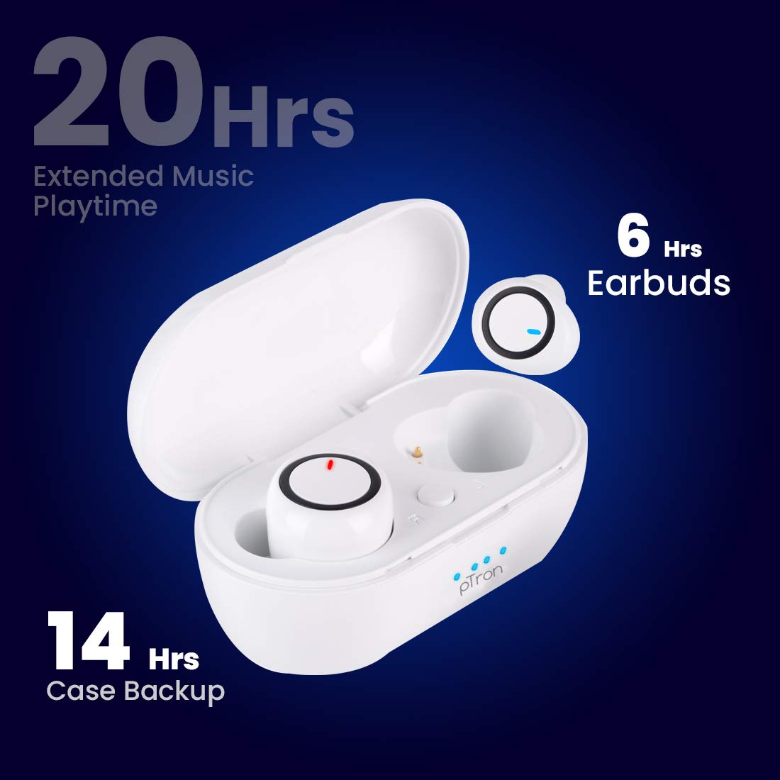 PTron Bassbuds in-Ear True Wireless Bluetooth 5.0 Headphones with Hi-Fi Deep Bass, 20Hrs Playtime with Case, Ergonomic Sweatproof Earbuds, Noise Isolation, Voice Assistance & Built-in Mic - (White)