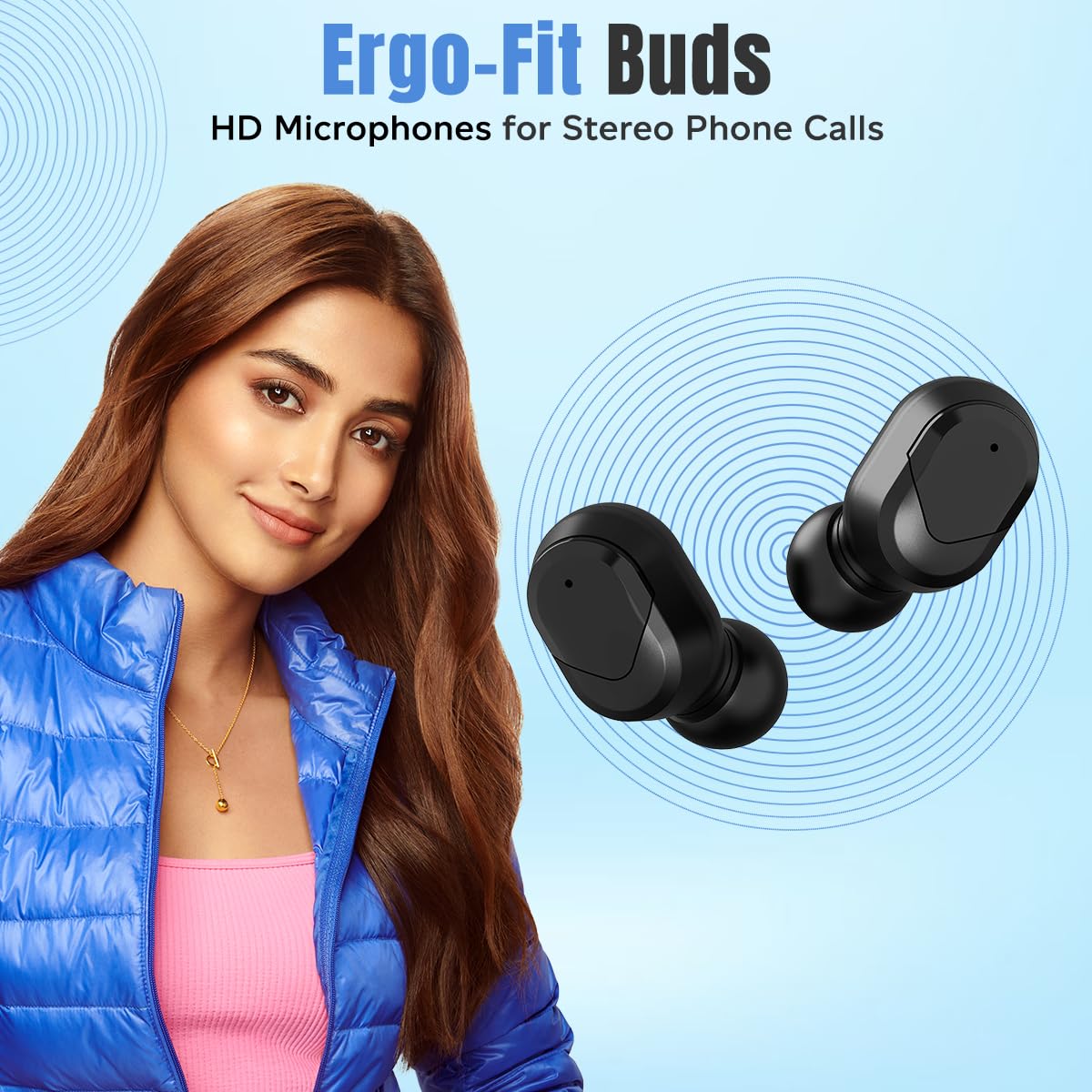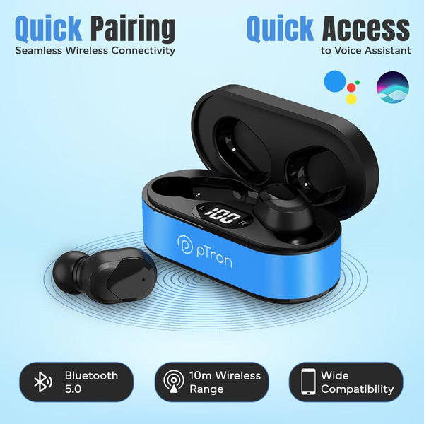 pTron Bassbuds Plus In-Ear TWS Earbuds with HD Mics, Bluetooth 5.0 Headphones with Immersive Sound, Stereo Calls, 28Hrs Playtime, Voice Assist Ready, IPX4 Water Resistant & Fast Charge (Electric Blue)