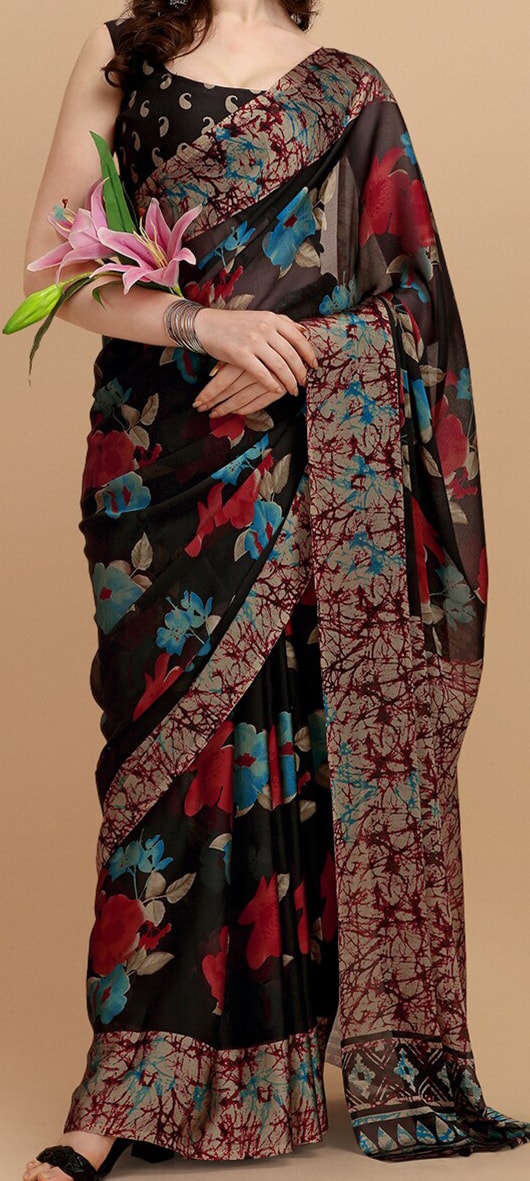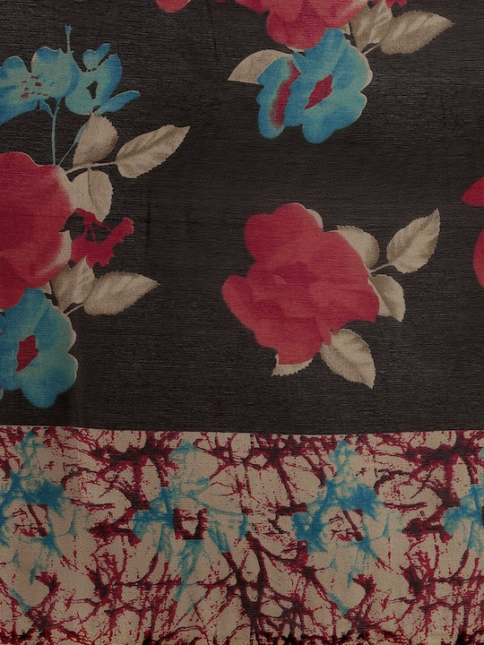 Black & Red Floral Printed Saree