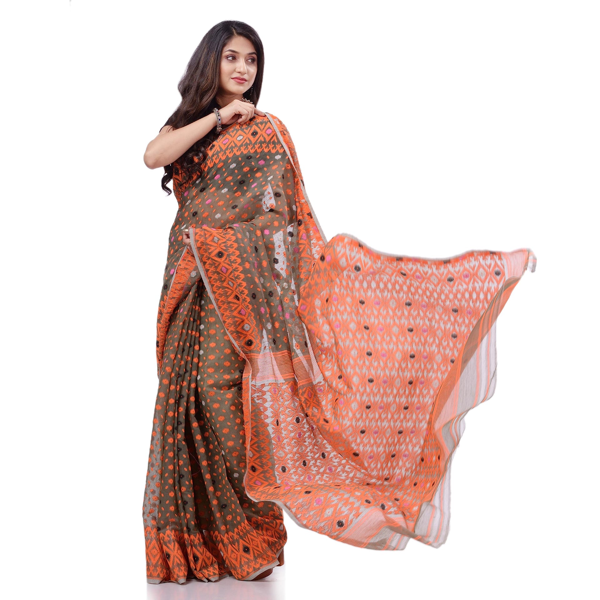 dB DESH BIDESH Women`s Jamdani Sarees For Women Cotton Silk saree Hirokduti Design Cotton Sarees Dhakai Jamdani Sarees For Women Handloom Sarees Without Blouse Piece (Grey Orange)