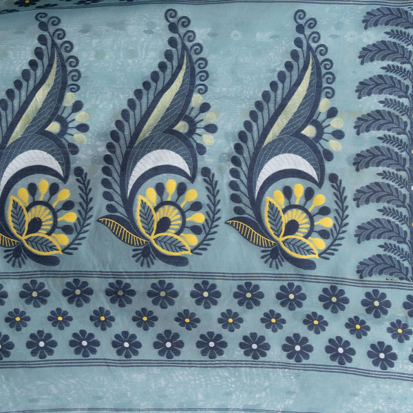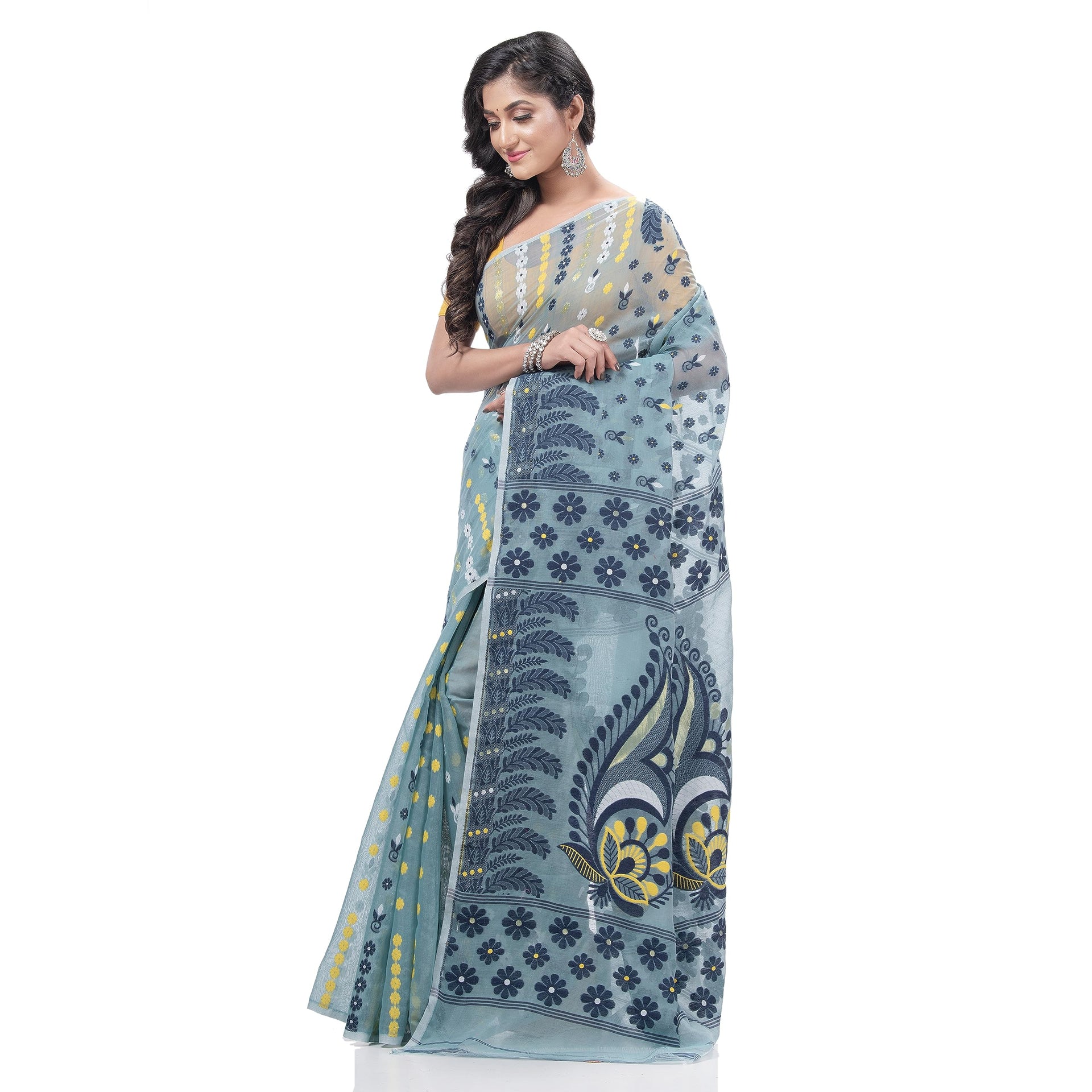 dB DESH BIDESH Women`s Resham Dhakai Jamdani Pure Cotton Handloom Saree Lojjaboti Design without Blouse Piece (Firoza Blue)