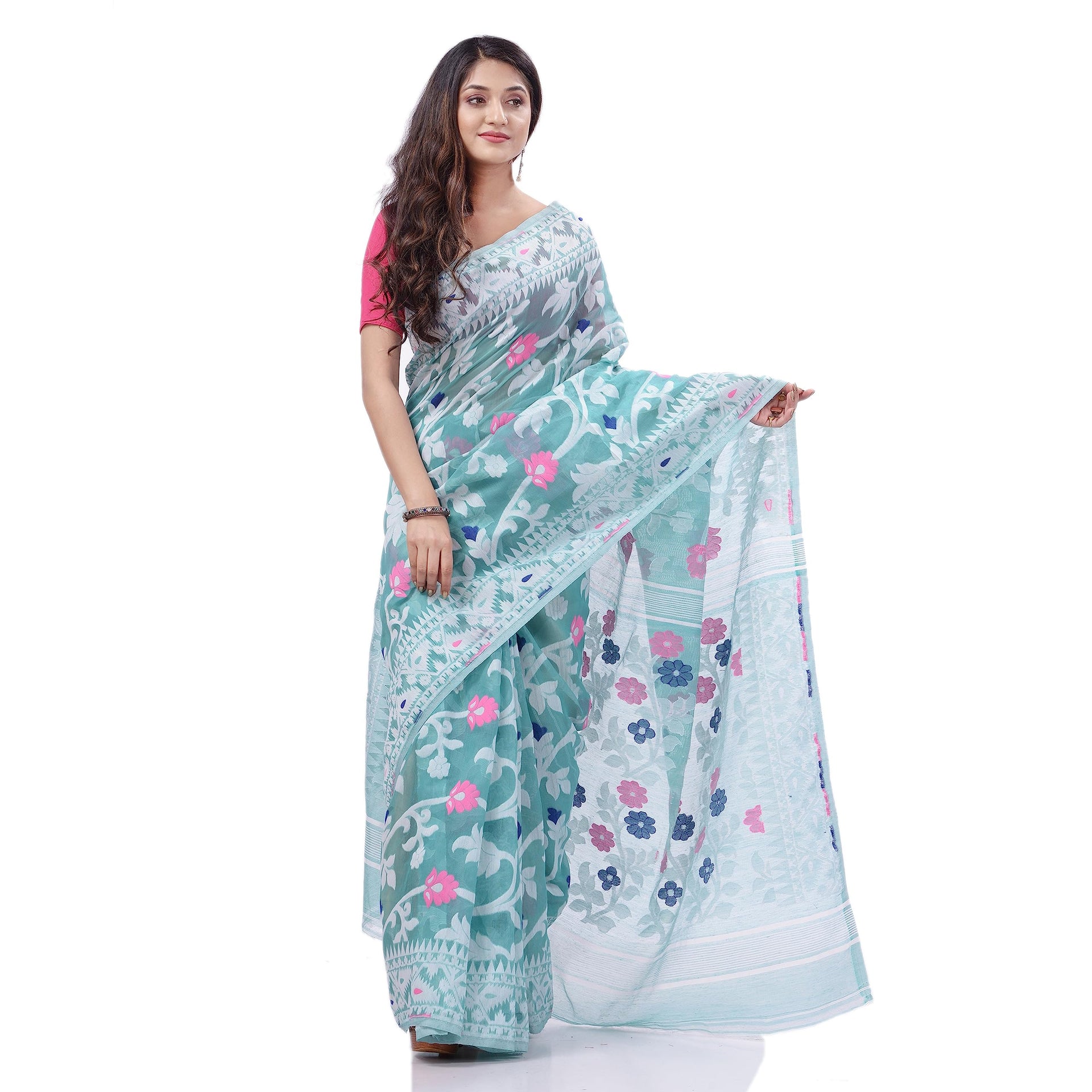 dB DESH BIDESH Women's Rangabati Resham Dhakai Jamdani Pure Cotton Handloom Saree Without Blouse Piece (Firoza, Multicolor)