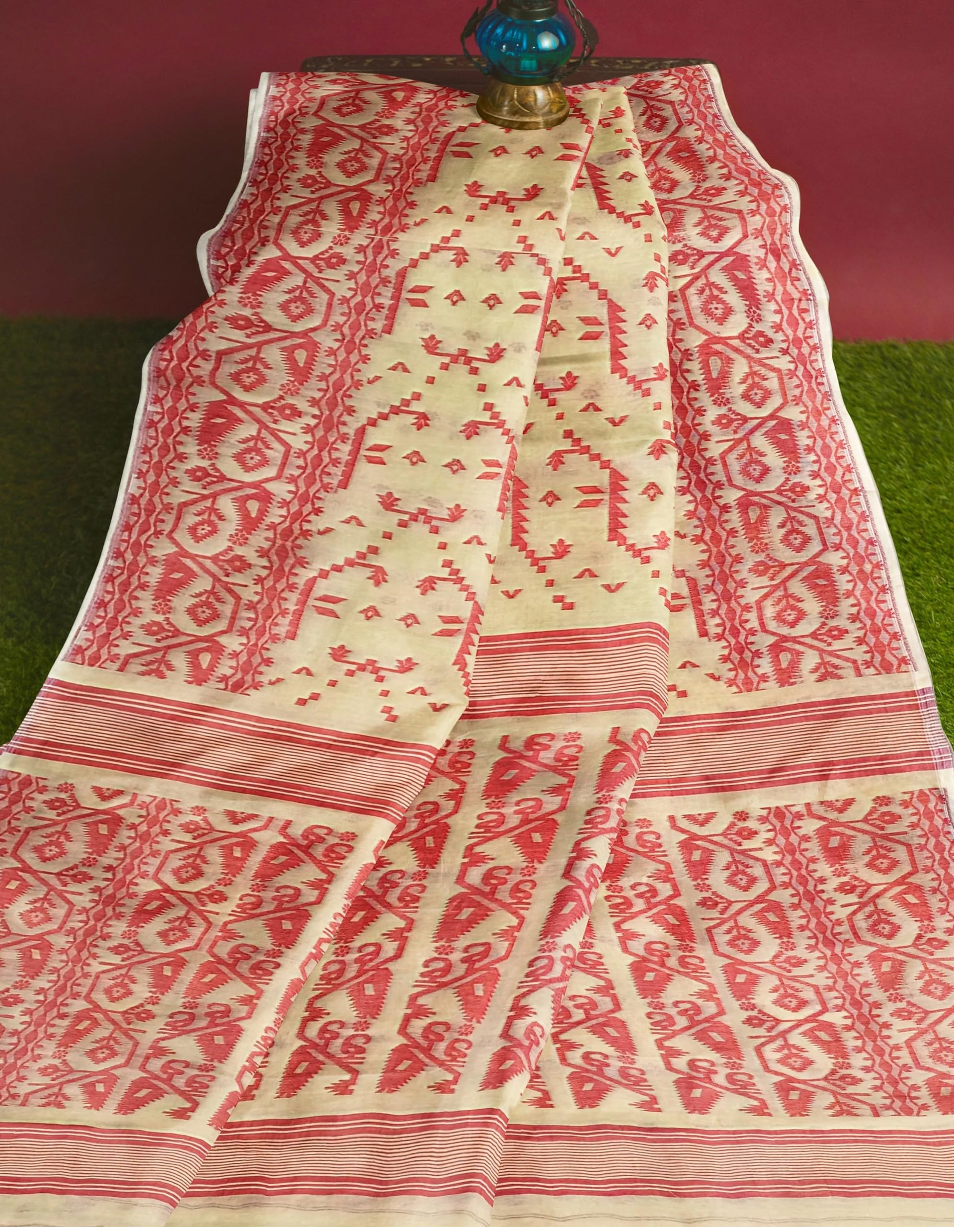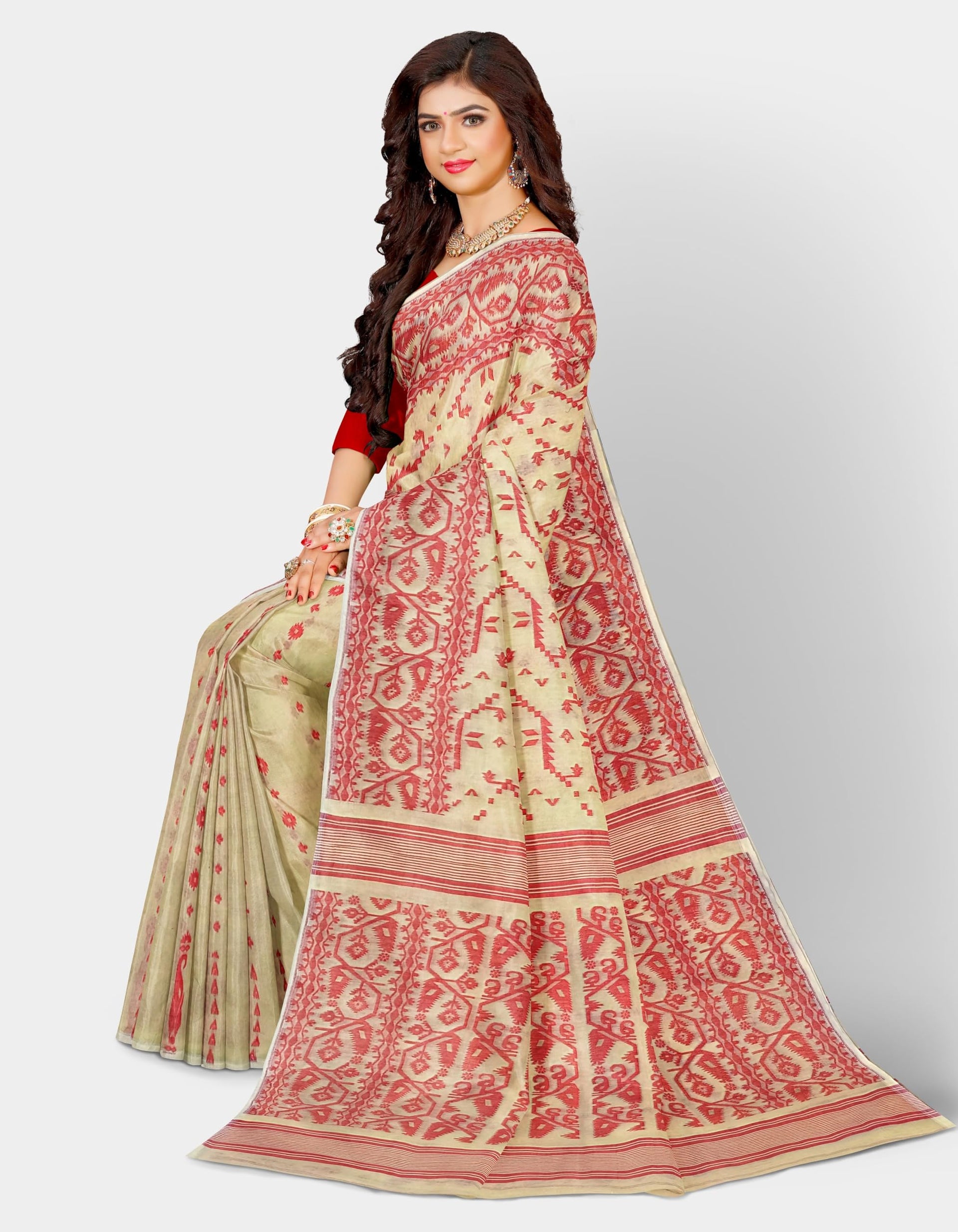 Mayabi Women's Off White & Red Dhakai Jamdani Cotton Silk Saree Traditional Bengali Tant Korat Work, Without Blouse Piece, Starched Texture