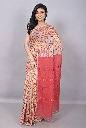 OISHANI SAREE GHOR Women's Traditional Bengal Cotton Resham Nakshi Design Jamdani Saree (Beige Red)