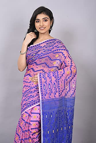 OISHANI SAREE GHOR Women's Traditional Bengal Cotton Resham Nakshi Design Jamdani Saree (Pink Blue)