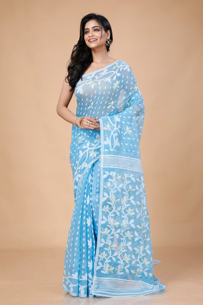OISHANI SAREE GHOR Women's Traditional Bengal Cotton Silk Belpata Jamdani Saree (Sky Blue)