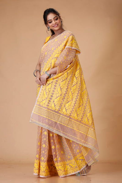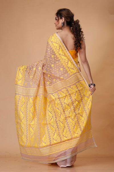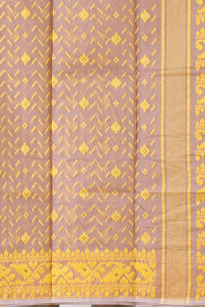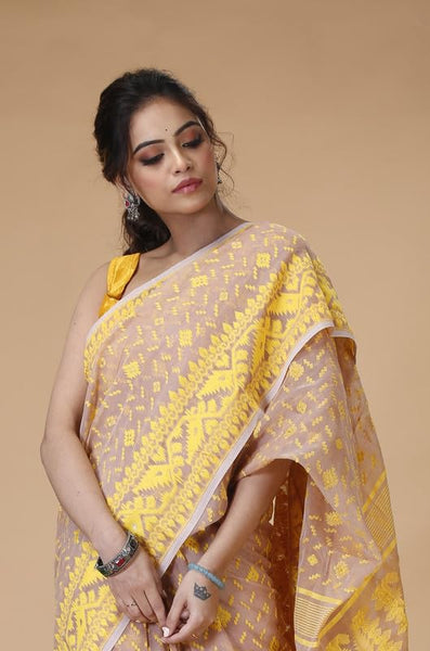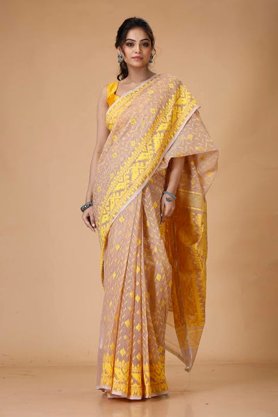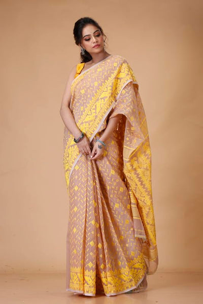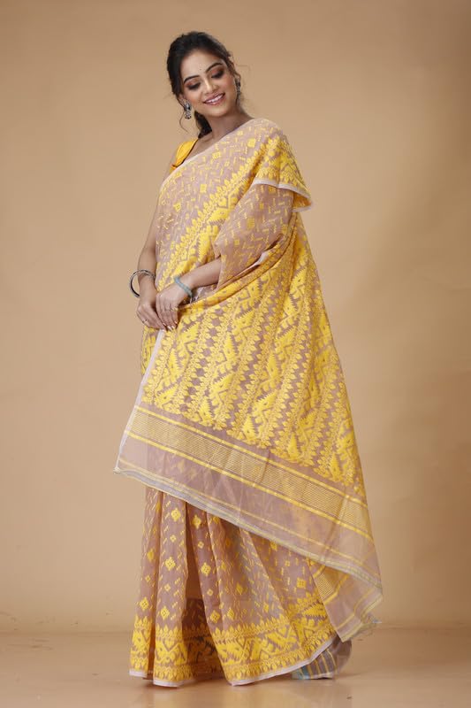 Oishani Saree Ghor Women's Traditional Bengal Cotton & Silk Soft Jamdani Saree - Beautiful Bokul Design Work - 5.5 metres Saree Without Blouse Piece_Pewater