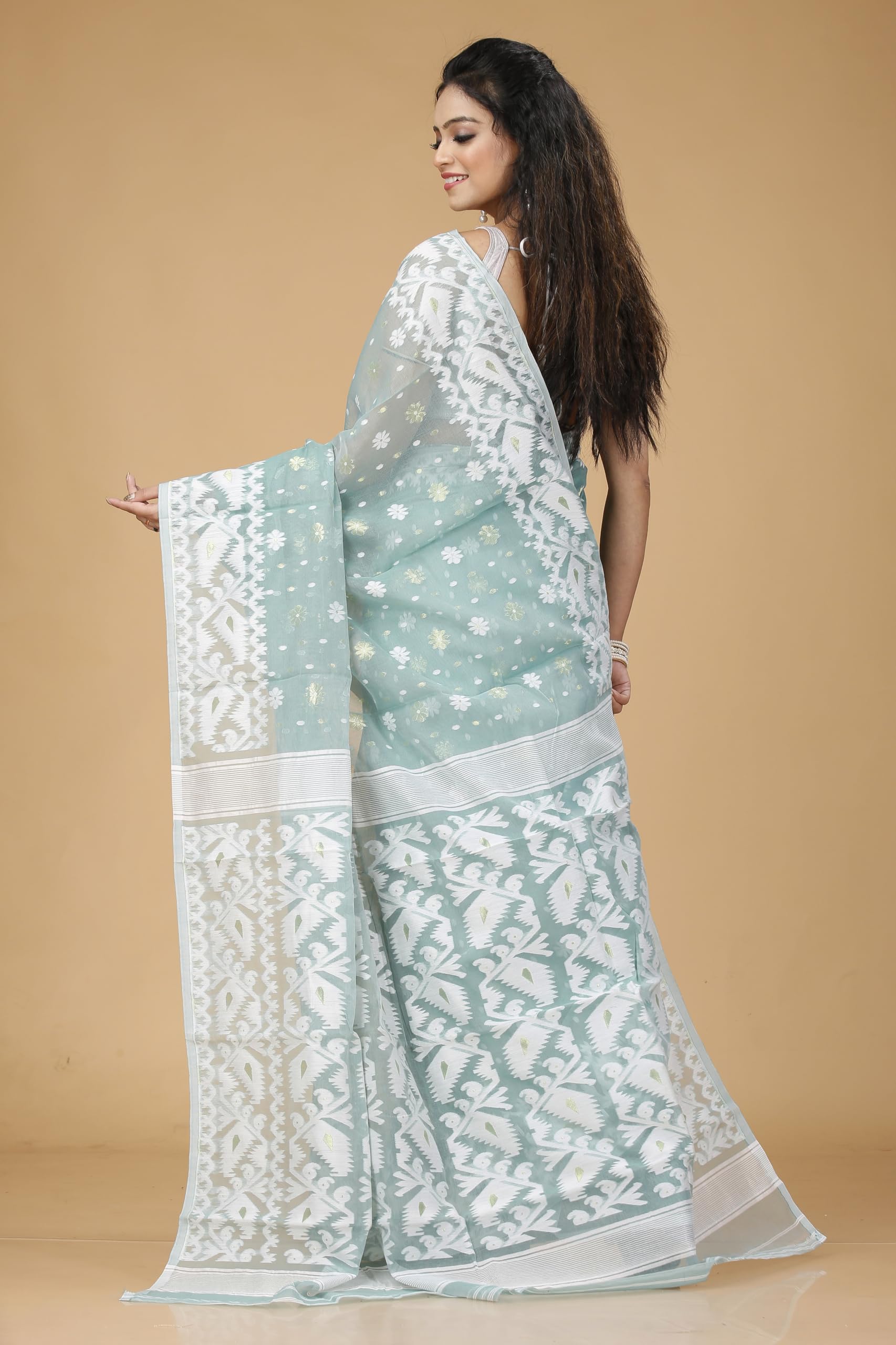 OISHANI SAREE GHOR Women's Traditional Bengal Cotton Silk Soft Jamdani Saree - Beautiful design and Quality - Without Blouse Piece (Pastel Turquoise)