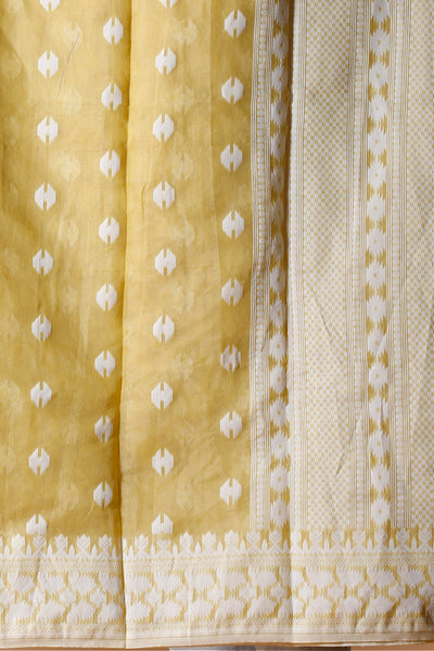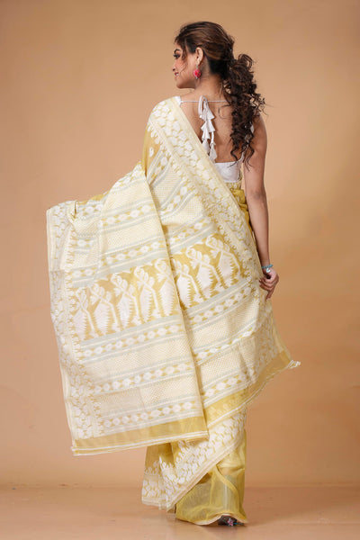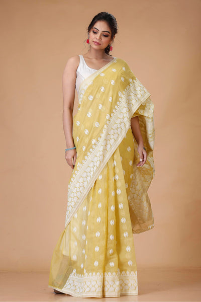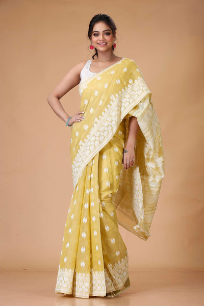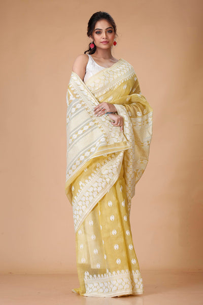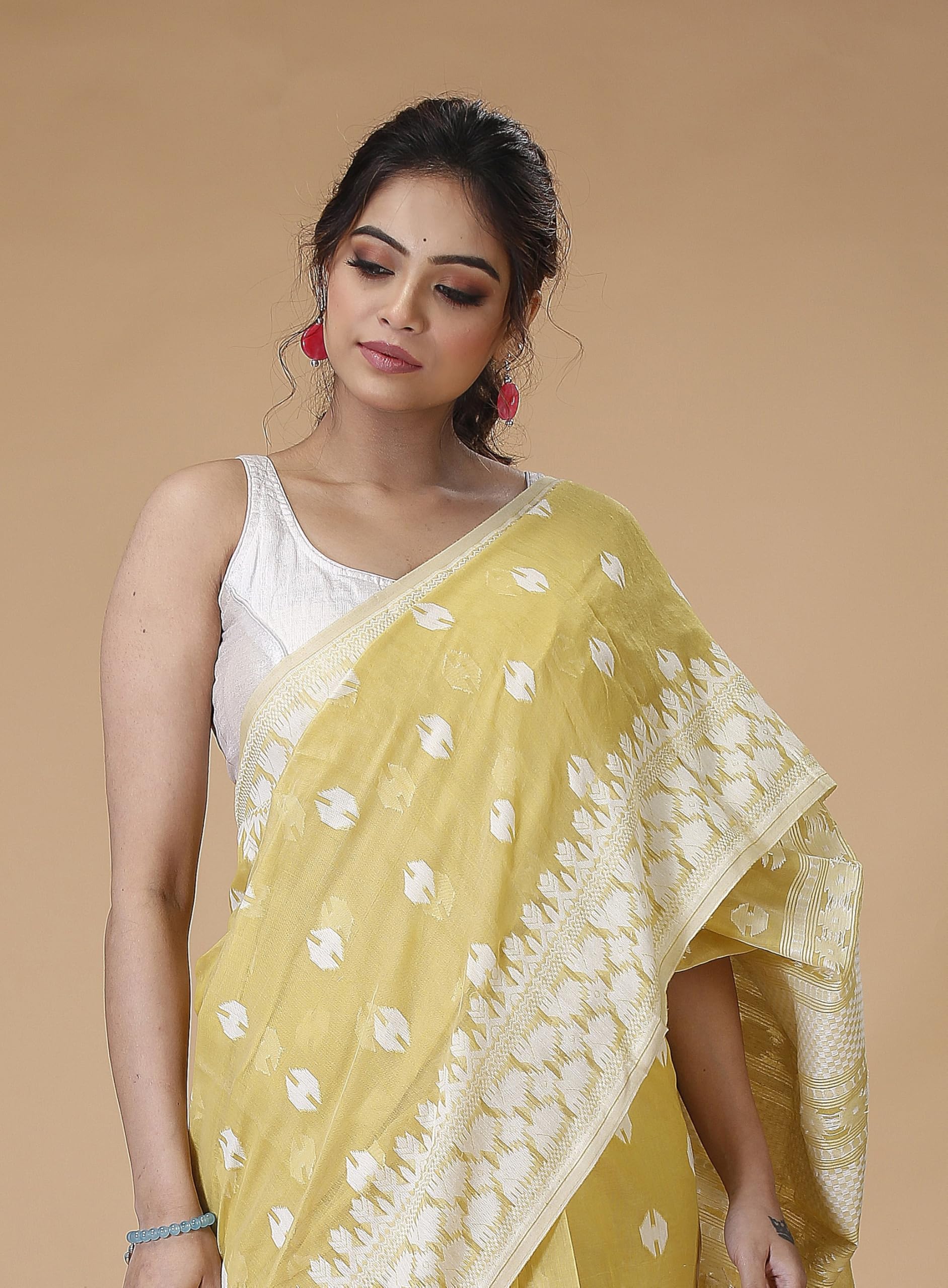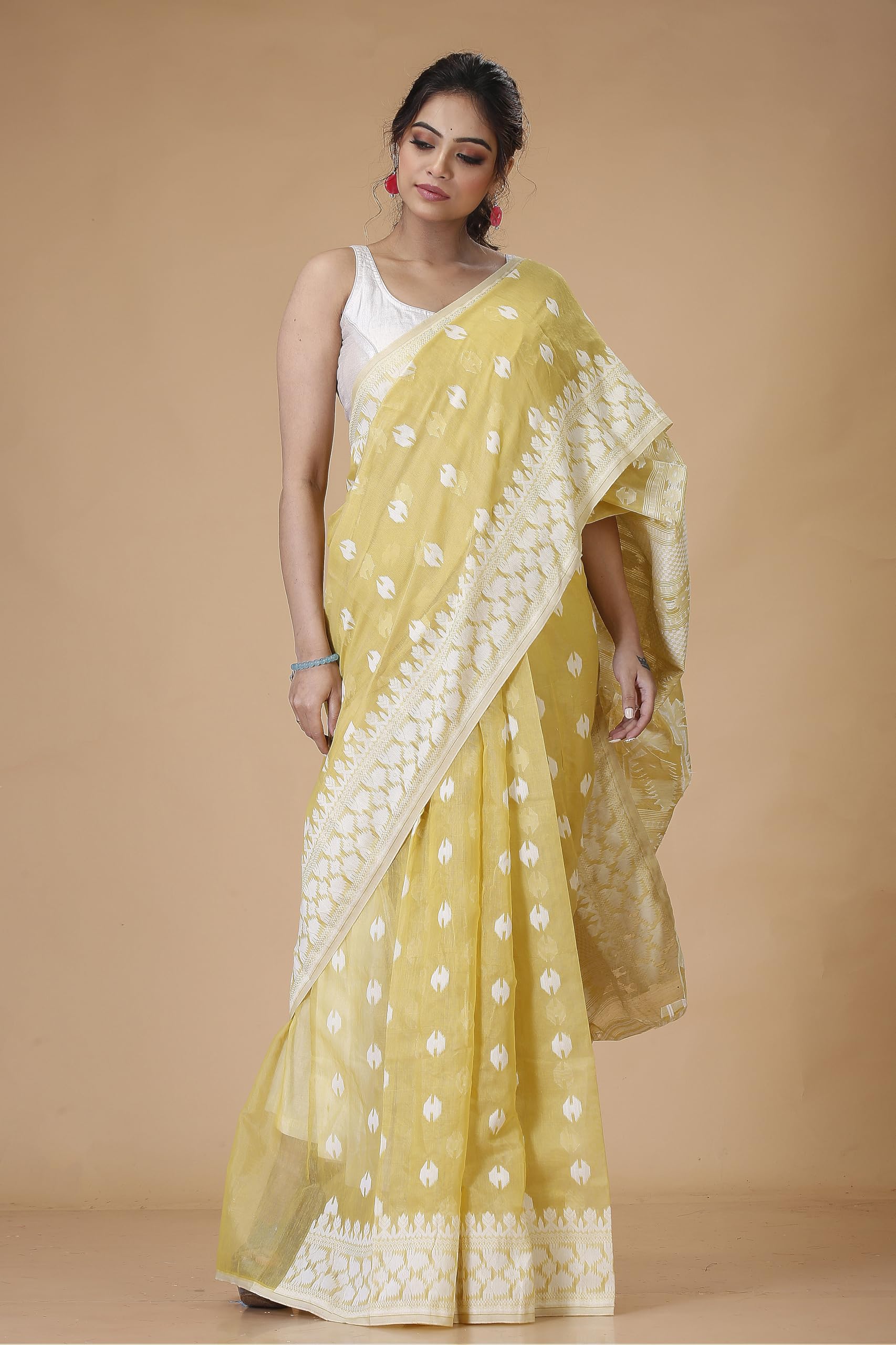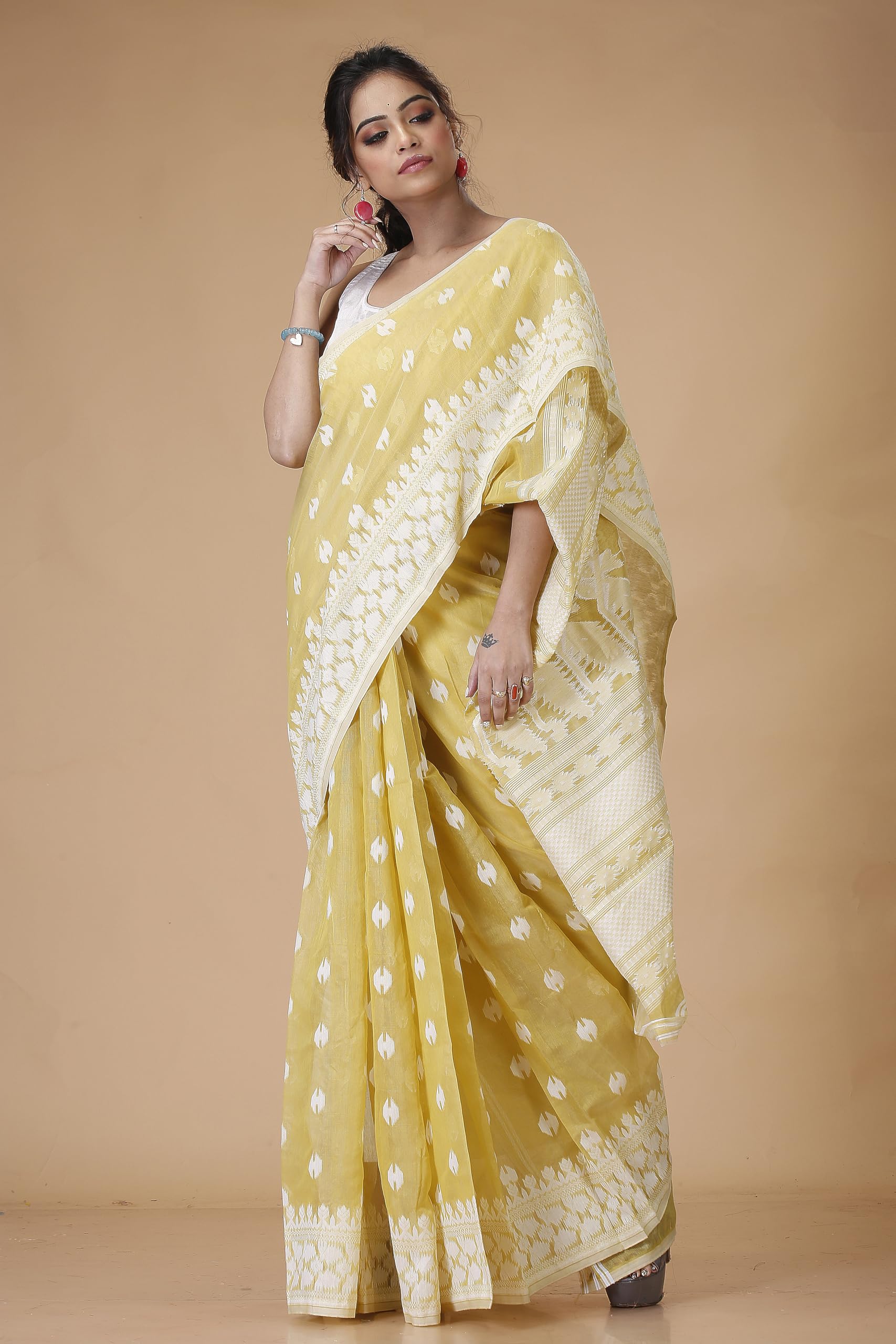 Oishani Saree Ghor Women's Traditional Bengal Cotton & Silk Soft Jamdani Saree - Beautiful Pallu Design Work - 5.5 metres Saree Without Blouse Piece_Pale Yellow