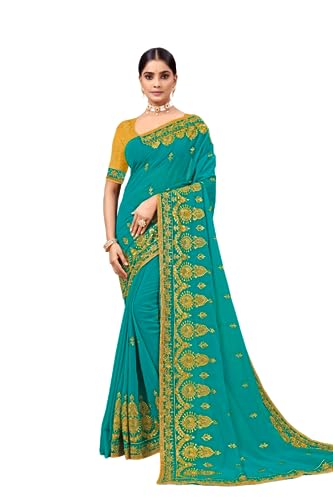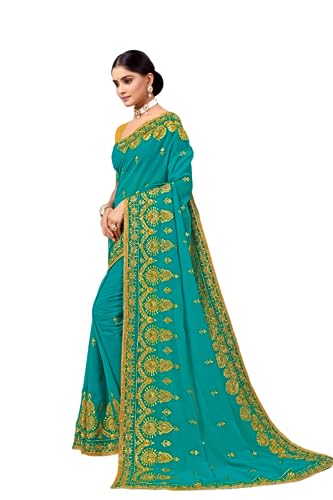 Radhe Radhey Women's New Net Embridered Sari With Unstitched Blouse (Free Size) (Firozi)