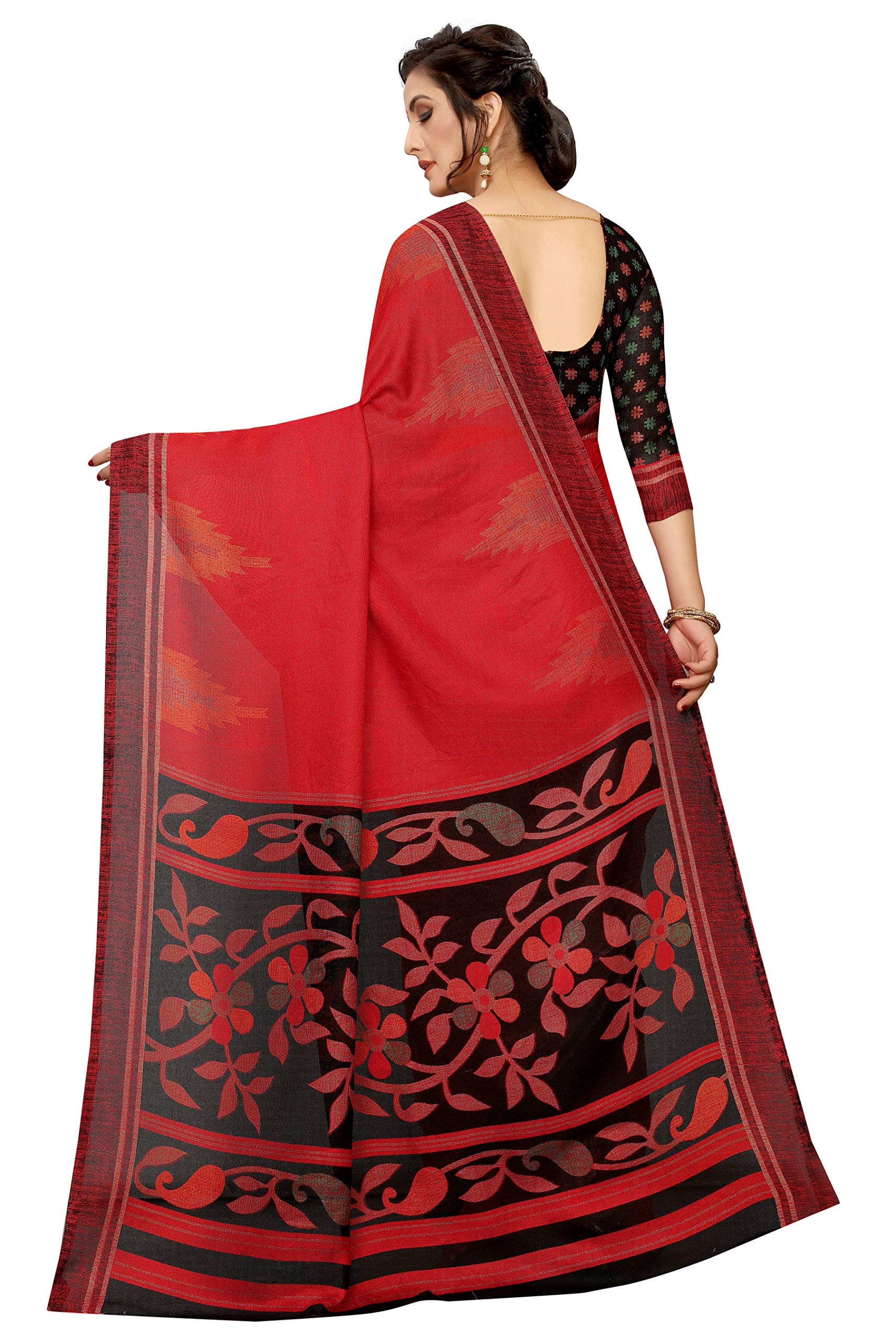 RAJESHWAR FASHION WITH RF Women's Soft Jute Printed Fancy Sarees For Women With Zari Border & Blouse(Red-Black_Free Size 6.30 Mtr)