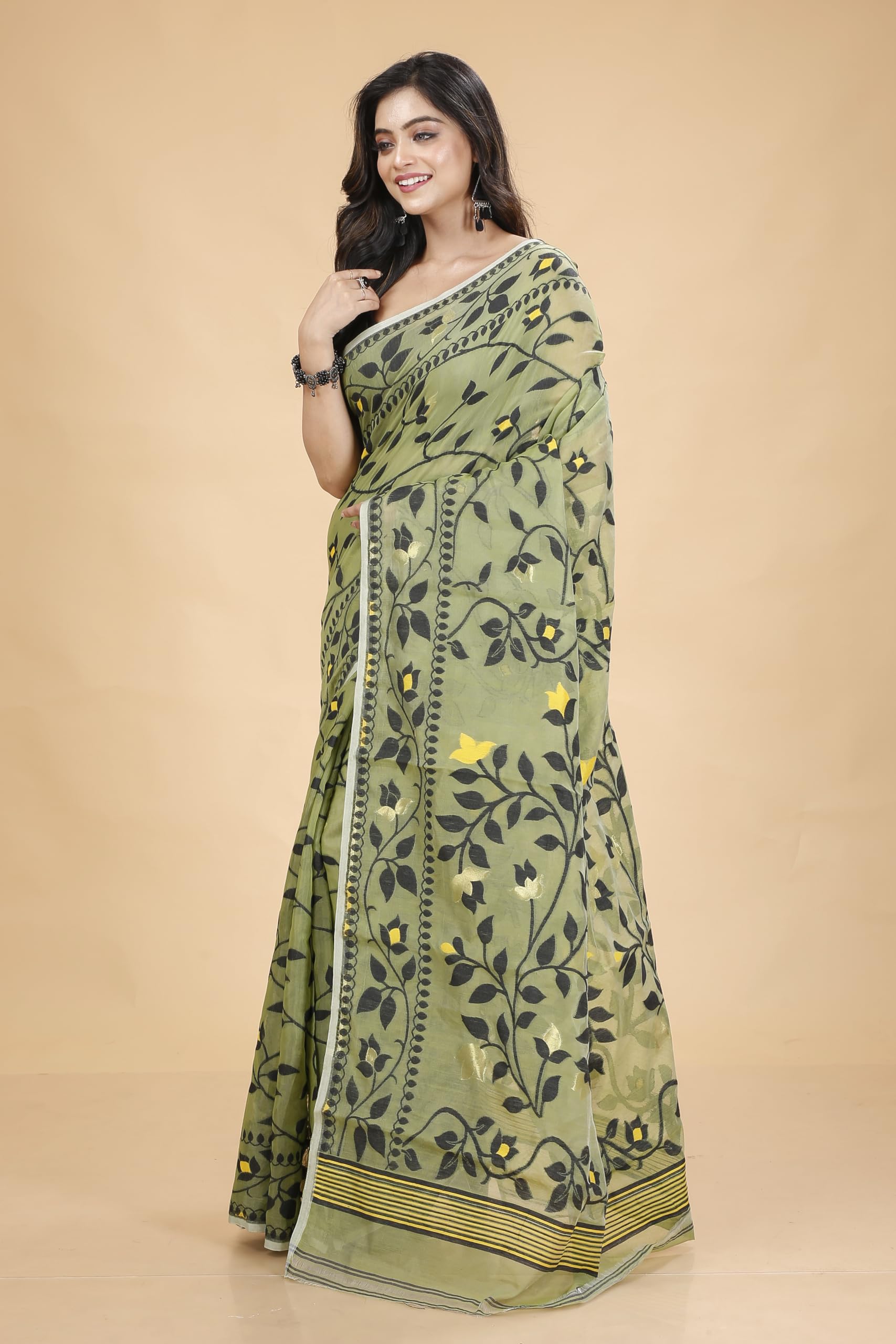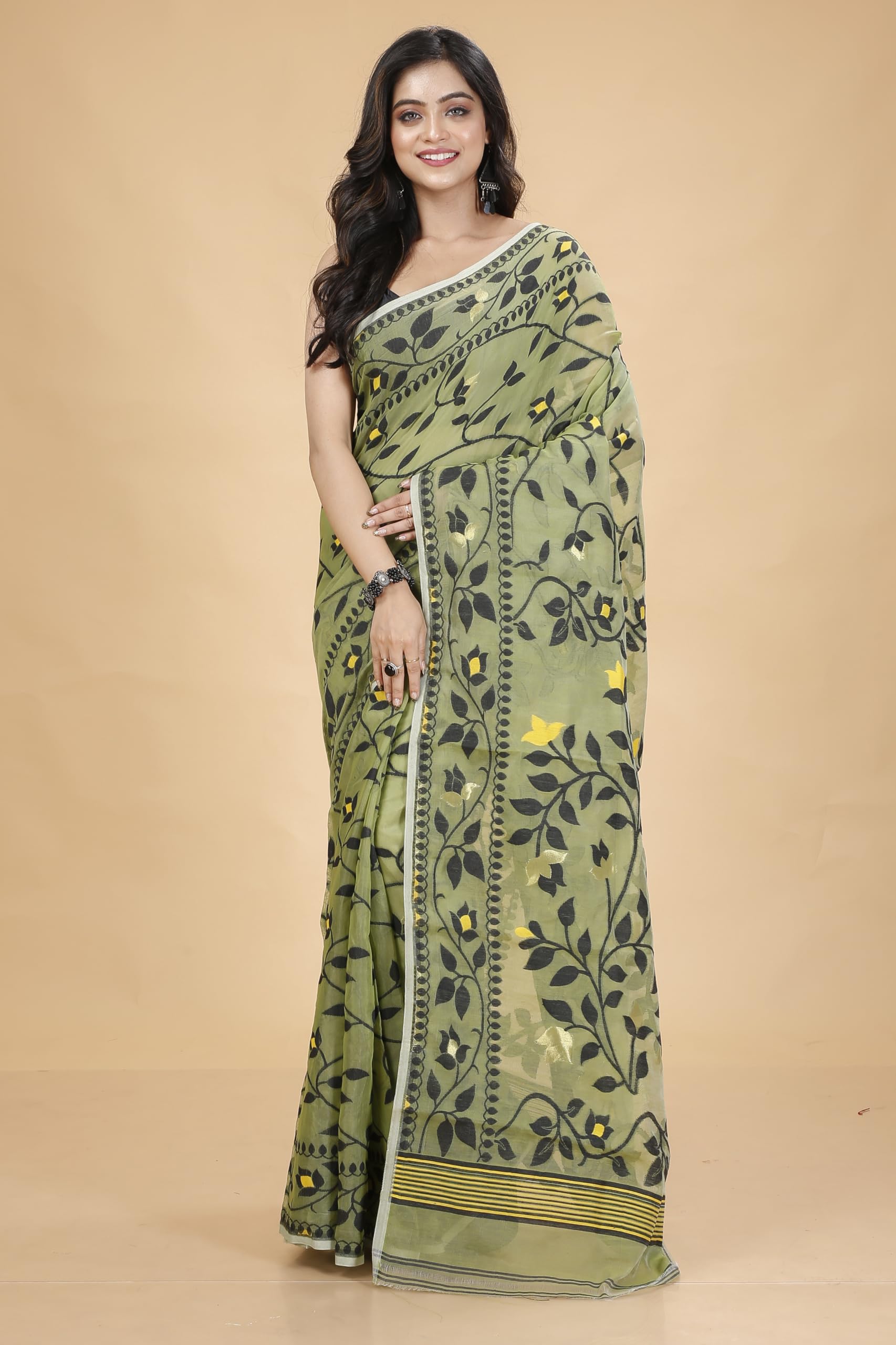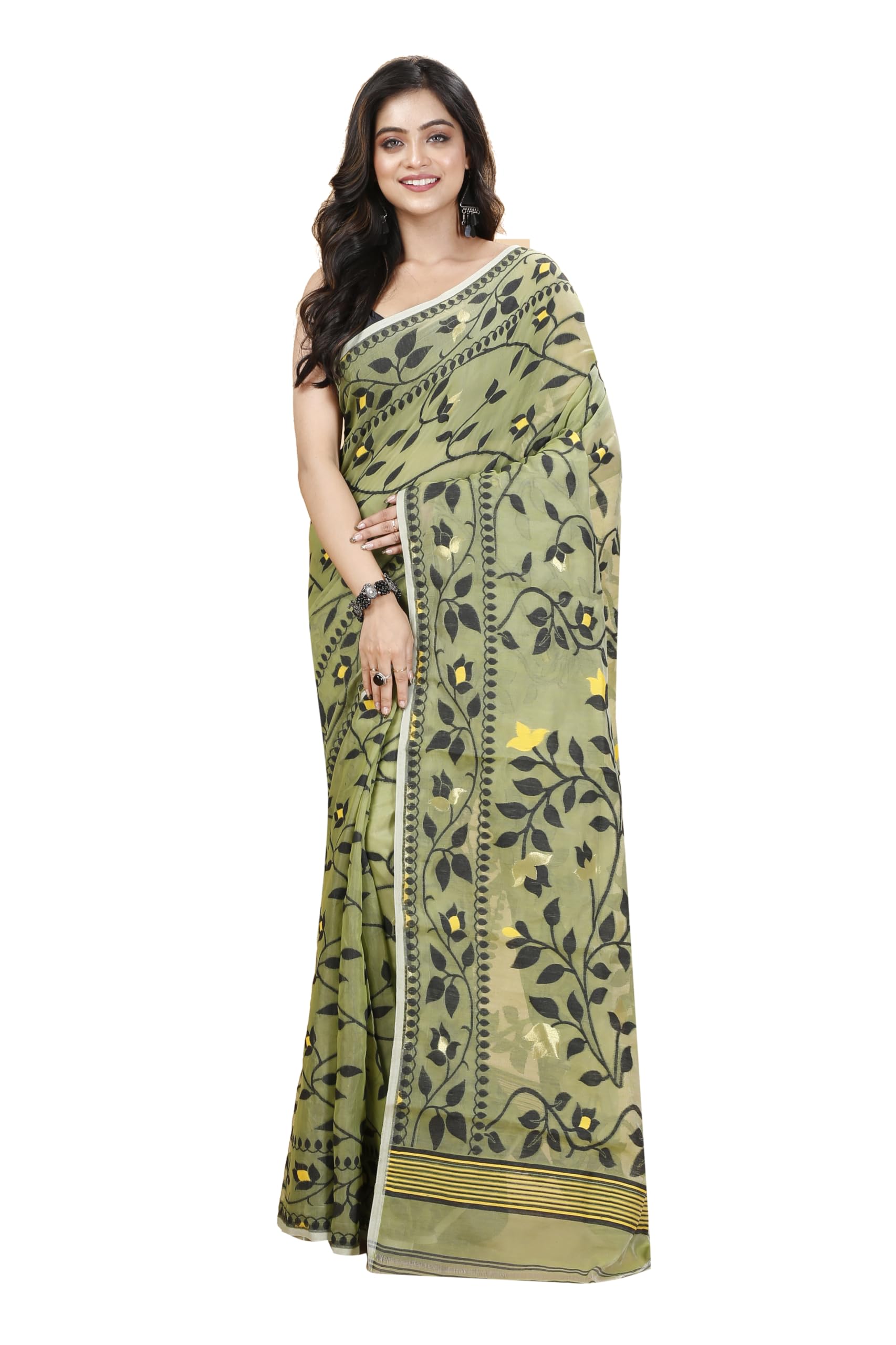 Tant Vastra Women’s Soft Resham Dhakai Lata Jamdani Saree without Starch And Without Blouse Piece (Light Pista)