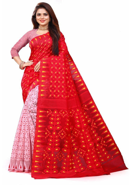 Women`s Bengal Handloom Tant Soft Dhakai Jamdani Cotton Saree Whole Body Design Without Blouse Piece (White Red)
