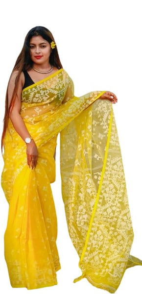 Women's Traditional Bengal Cotton Silk Jamdani Saree Without Blouse Piece (Yellow)