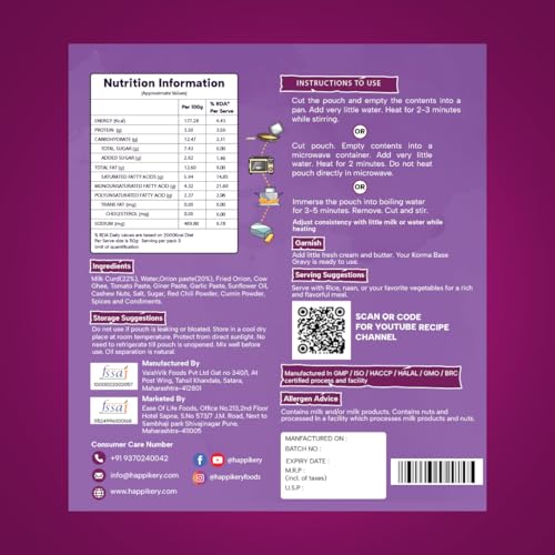 Happikery Korma Gravy Easy to Cook Gravy -1Kg (Veg Mix, Upto 5-7 Servings) |Pure Vegetarian | Mughlai-Style Curry Prepared with A Blend of Cream, Yoghurt, Cashews and Spices | Ready in 3 Min