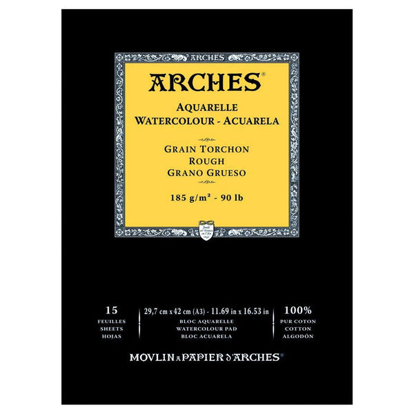 Arches Watercolour- Aquarelle - A3 (29.7 cm x 42 cm) Natural White Rough Grain 185 GSM Paper, Short Side Glued Pad of 15 Sheets