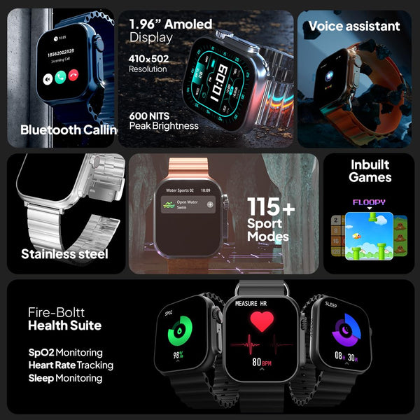 Fire-Boltt Newly Launched Gladiator + 1.96” AMOLED Display Luxury Smartwatch, Rotating Crown, 115+ Sports Modes & Bluetooth Calling, AI Voice Assistant, Gaming