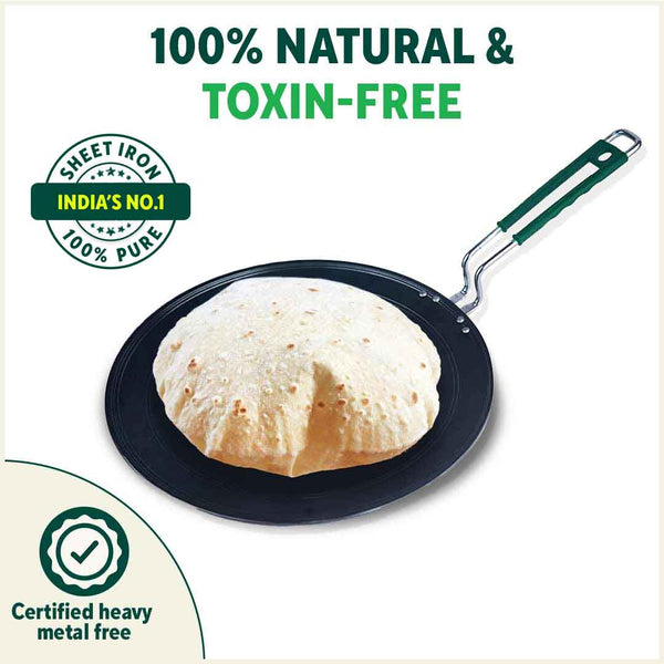 🌿100% NATURAL & TOXIN-FREE: The Indus Valley’s Pure Sheet Iron Concave Roti/Chappati Tawa will give you a highly satisfying cooking experience. Made from 100% pure iron, the iron roti tawa with handle is food-safe and toxin-free.