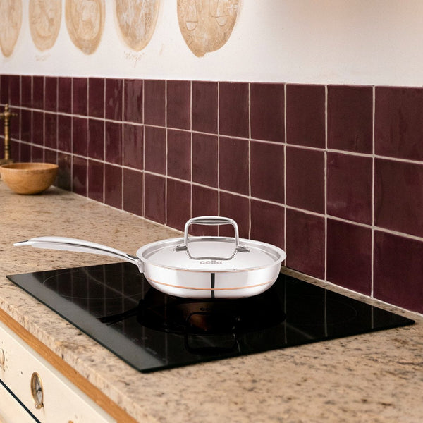 A 5-ply stainless steel fry pan is a premium cooking utensil made from high-quality stainless steel material. Its 5-layer construction ensures even heat distribution for precise and efficient cooking. The fry pan features a nonstick cooking surface, allowing for easy food release and effortless cleaning. It is equipped with a sturdy handle for a secure grip and safe handling. This versatile fry pan is perfect for frying, sautéing, searing, and browning a variety of ingredients. With its durable construction and exceptional performance, it is an essential tool for any kitchen.
