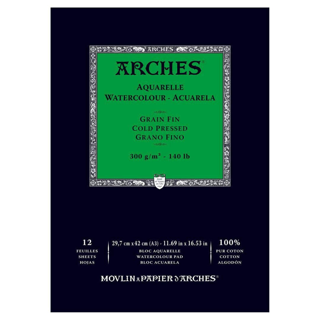 Arches Watercolour- Aquarelle - A3 (29.7 Cm X 42 Cm) Natural White Fine Grain/Cold Press 300 Gsm Paper- Short Side Glued Pad Of 12 Sheets
