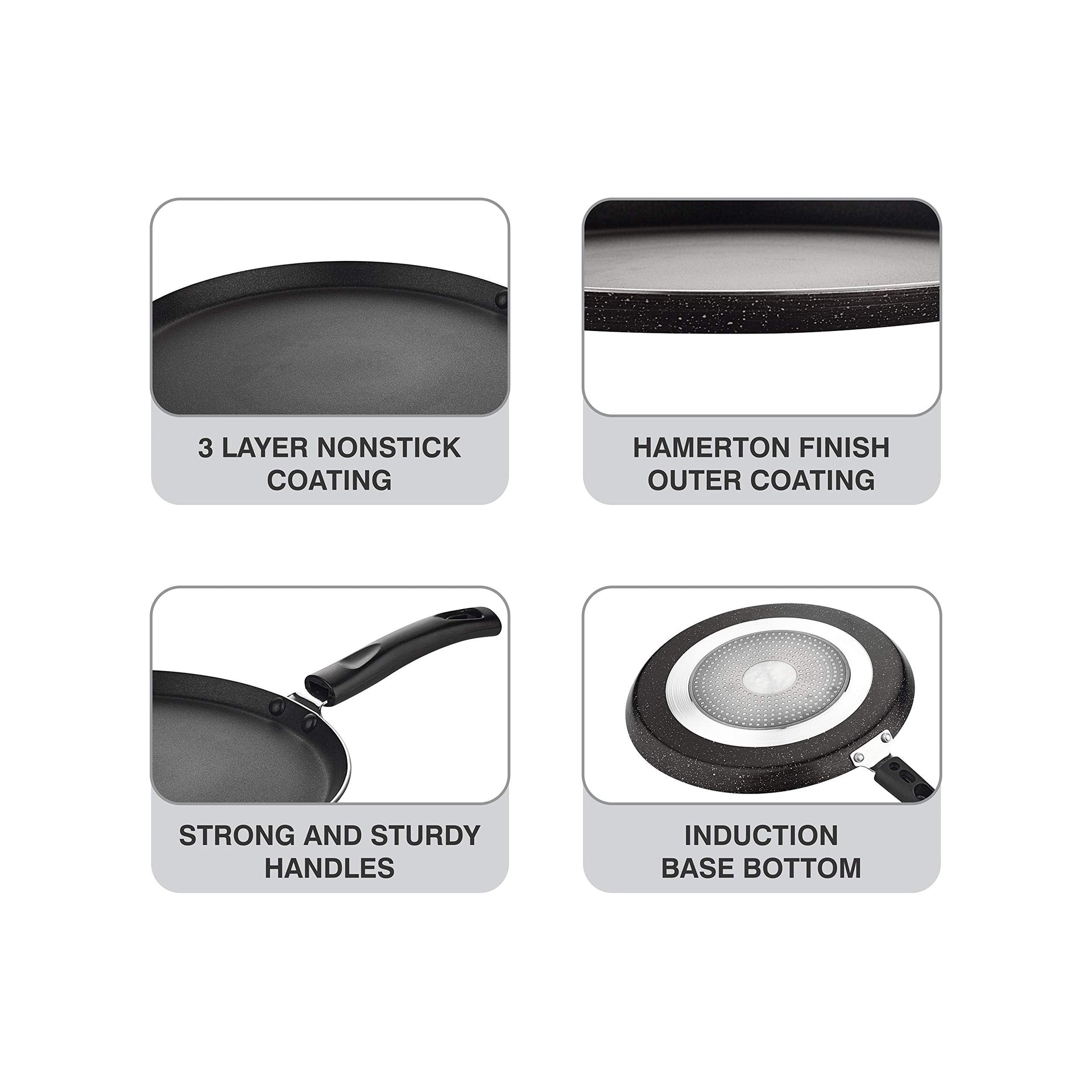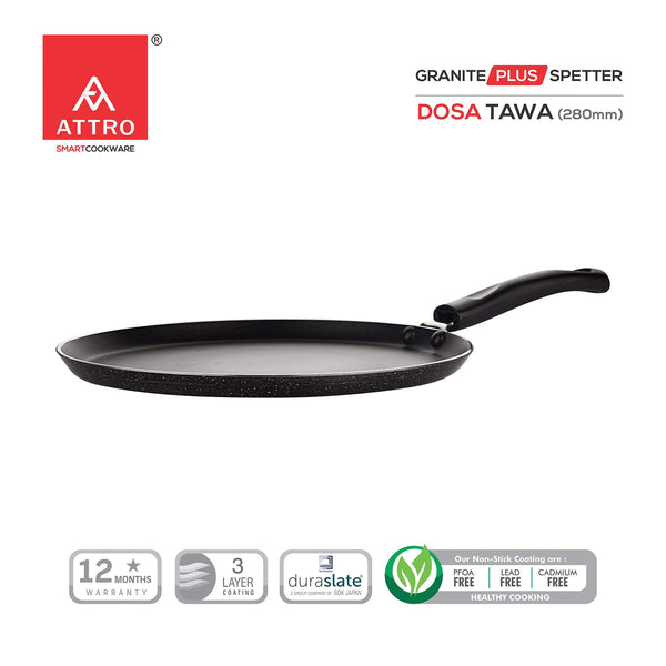 Details: Attro comes with variety of superior quality products. Dosa Tawa is made from pure grade virgin aluminum which aids in faster cooking and even heat distribution. This ergonomically designed non-stick dosa tawa. It can be used on cooking appliances such as stove top, gas cooktop, induction. Made from aluminium, the Dosa Tawa Non-stick 3 layer ensures high heat conductivity, thereby providing high efficiency while cooking. Featuring a non-stick coating, this dosa tawa can greatly reduce your oil consumption, resulting in healthier meals for you and your family. Featuring an ergonomic handle that stays cool while being used on the stovetop, you can easily handle this pan without worrying about burning your hands.