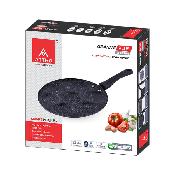 Attro Non Stick Heavy Duty 7 Cavity Single Handle Uttapam Tawa, Spatter Finish, Black